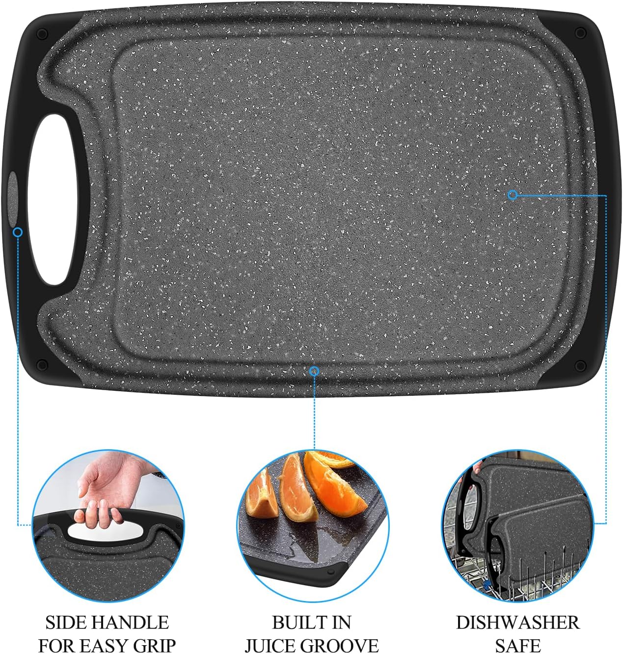 【Juice Grooves & Non-slip】Deep grooves along the border of the cutting board help catch the juices from food so that they won’t spill on your countertops. We designed non-slip mats on the four corners of the cutting board to keep it in place even when cutting.