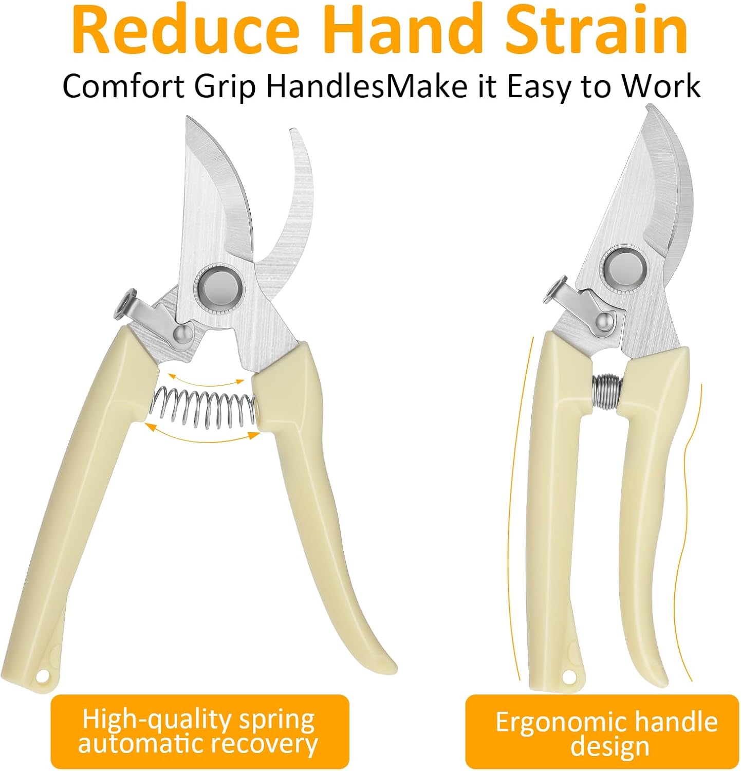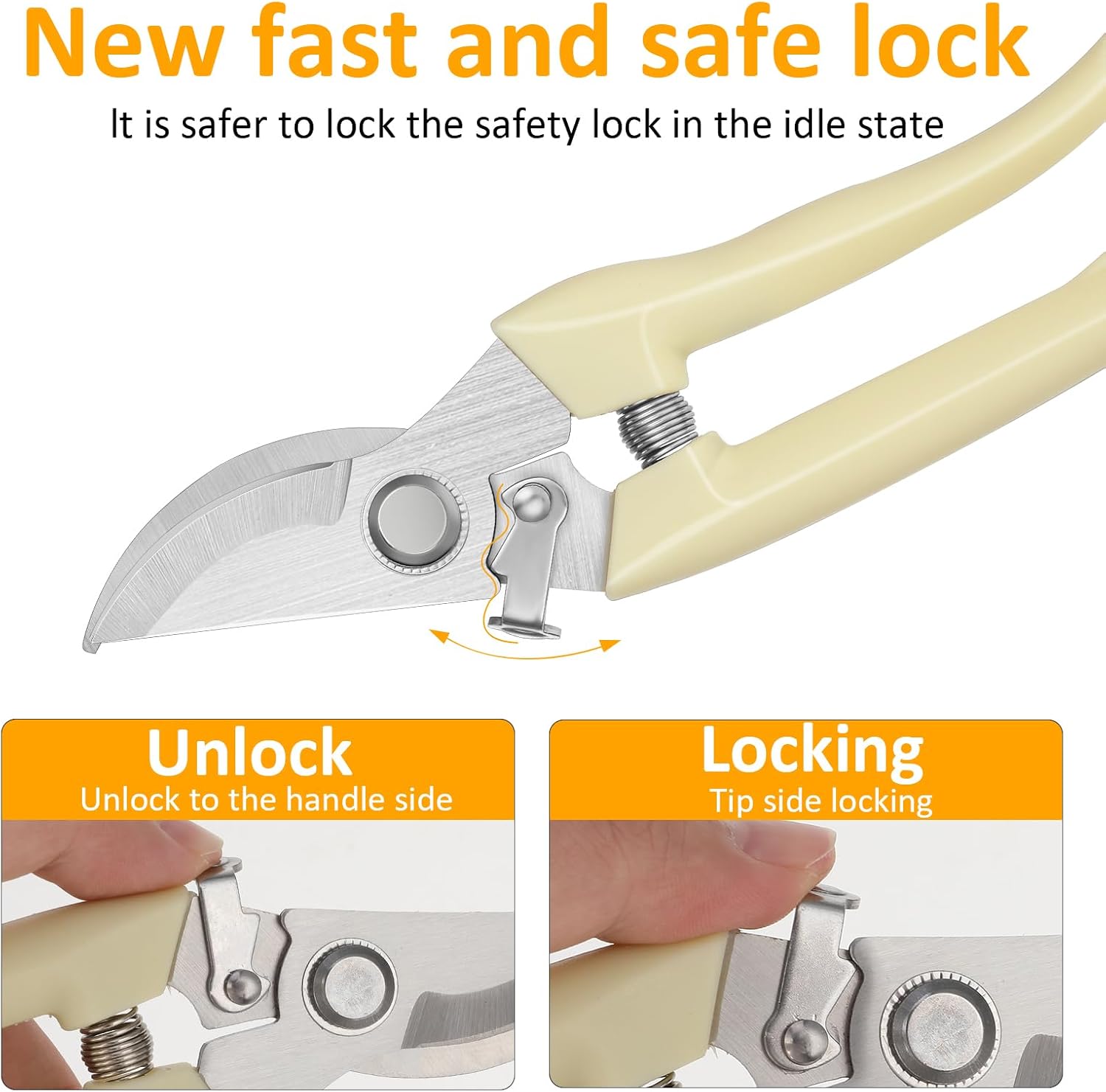 Convenient Lock: Garden remover cut have a tip arc design, flower scissors is very convenient and practical, and the blades are neat, allowing the pruning process to be done without branching. With the way the spring is designed, pruning shears stays loose and you can keep moving