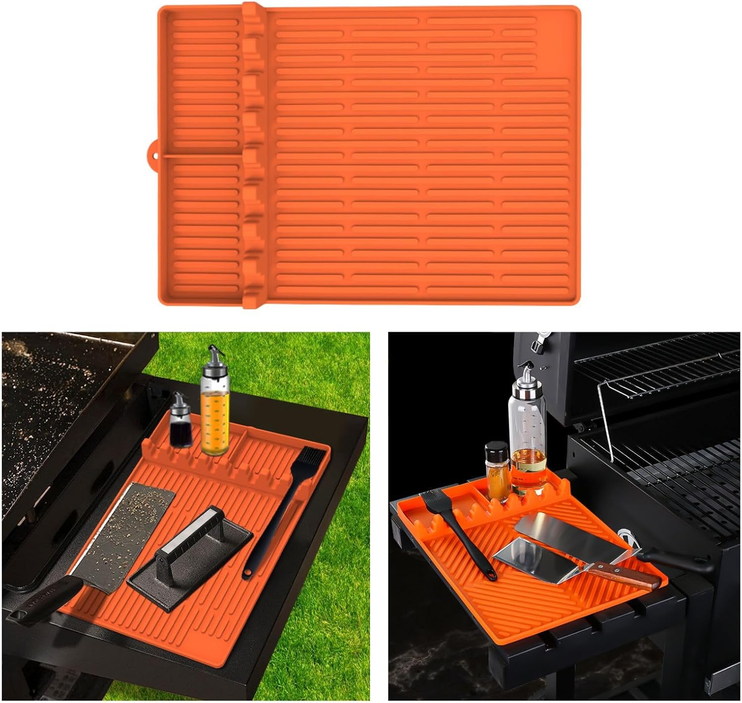 Versatile mat:Not limited to kitchen use, this versatile mat can also serve as a drying mat, insulation pot pad, table mat, coaster, anti-scald pad, jar opener, pot mat, shovel, and spoon rest, and more. Its multi-functional design ensures that you can get the most out of this product. Add To Basket Add To Basket Add To Basket Customer Reviews 5.0 out of 5 stars 5.0 out of 5 stars — — Price £16.99£16.99 £24.99£24.99 £23.99£23.99 SIZE Dishwash Safe ✓ ✓ ✓ ✓ 🍖【Organize Your Grill Side Shelf 】: Our Silicone Grill Tools Mat is the perfect solution for organizing and protecting your Blackstone side shelf. With 8 slots, it can easily hold your spoons, spatulas, ladles, brushes, tongs, or forks, providing flexibility for all your barbecue needs. Design with 3-in-1, not only can use for grill, BBQ caddy, ladle spoon, holder and multiple utensils holder, but also can hold oil bottle seasoning, jars.