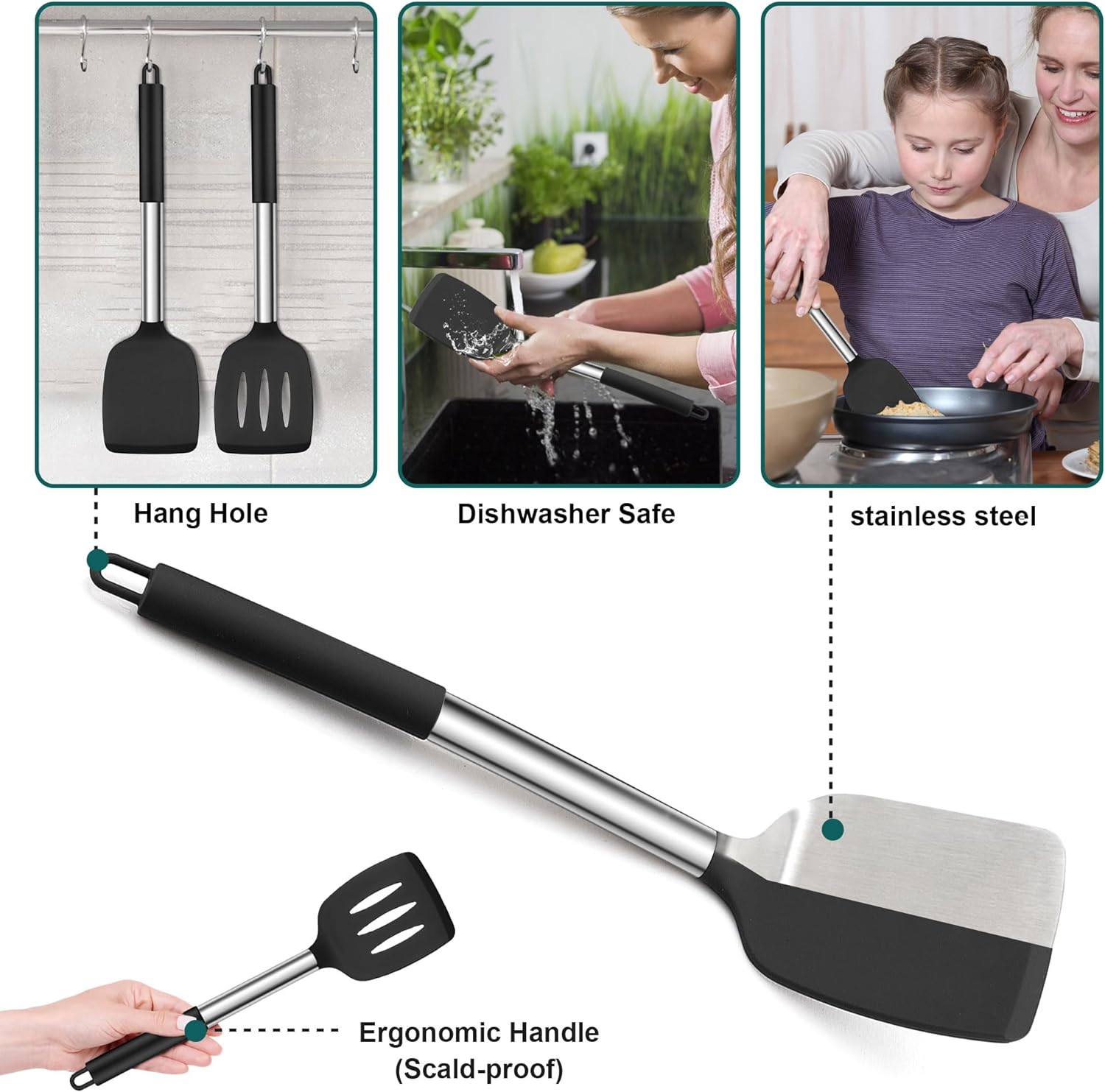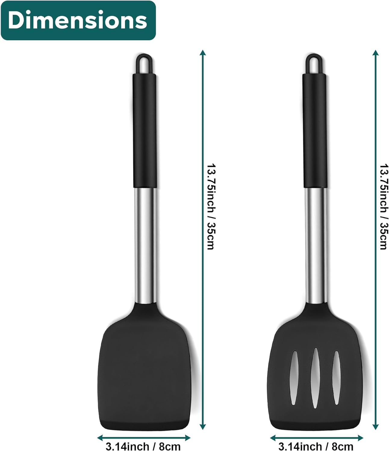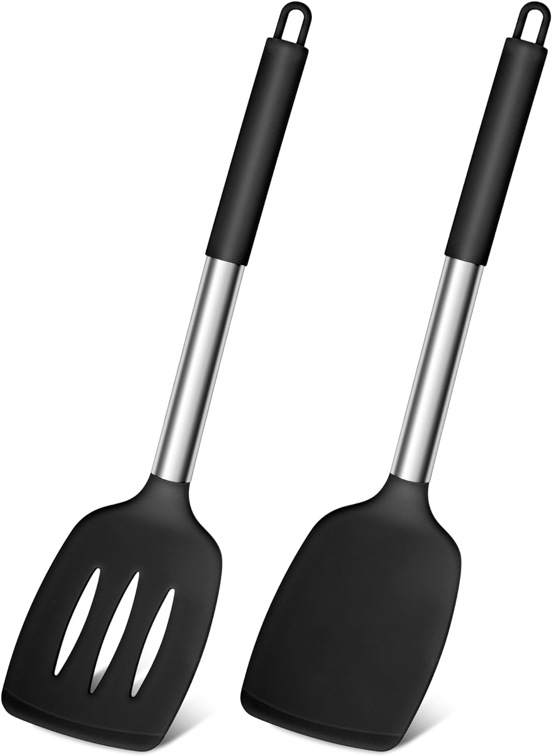 Silicone Spatula, Joyfair Stainless Steel Spatula Pack of 2, Cooking Turner/Non Stick Kitchen Slotted Spatula Ideal for Fish, Eggs, Pancakes, Heat Resistant & Dishwasher Safe, Black