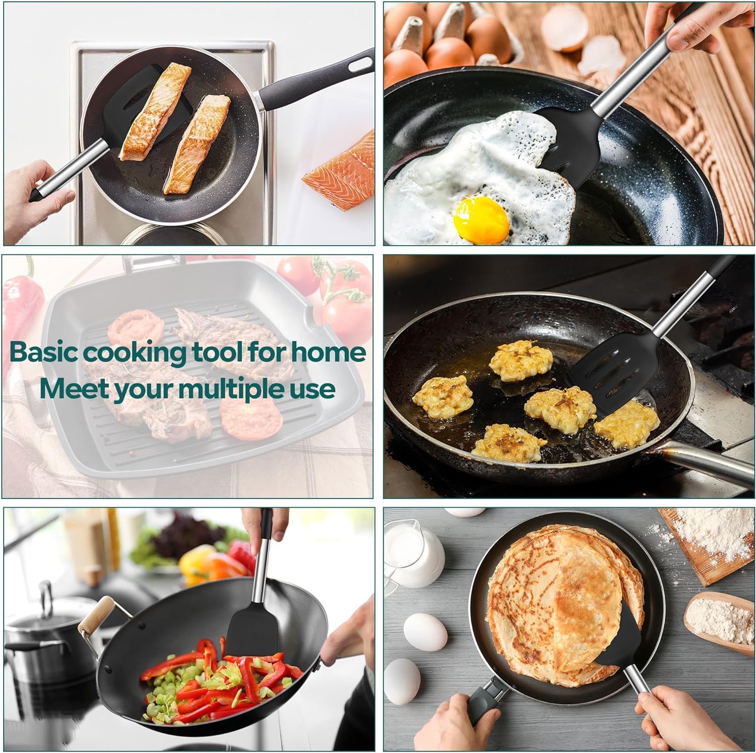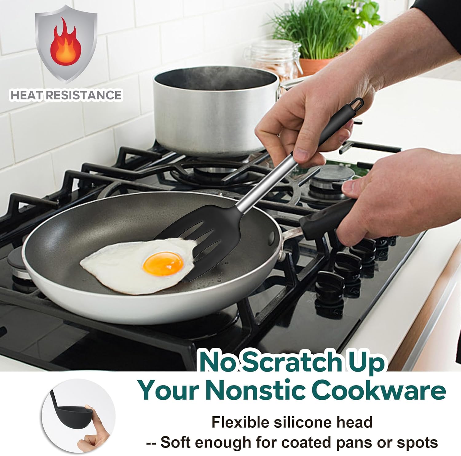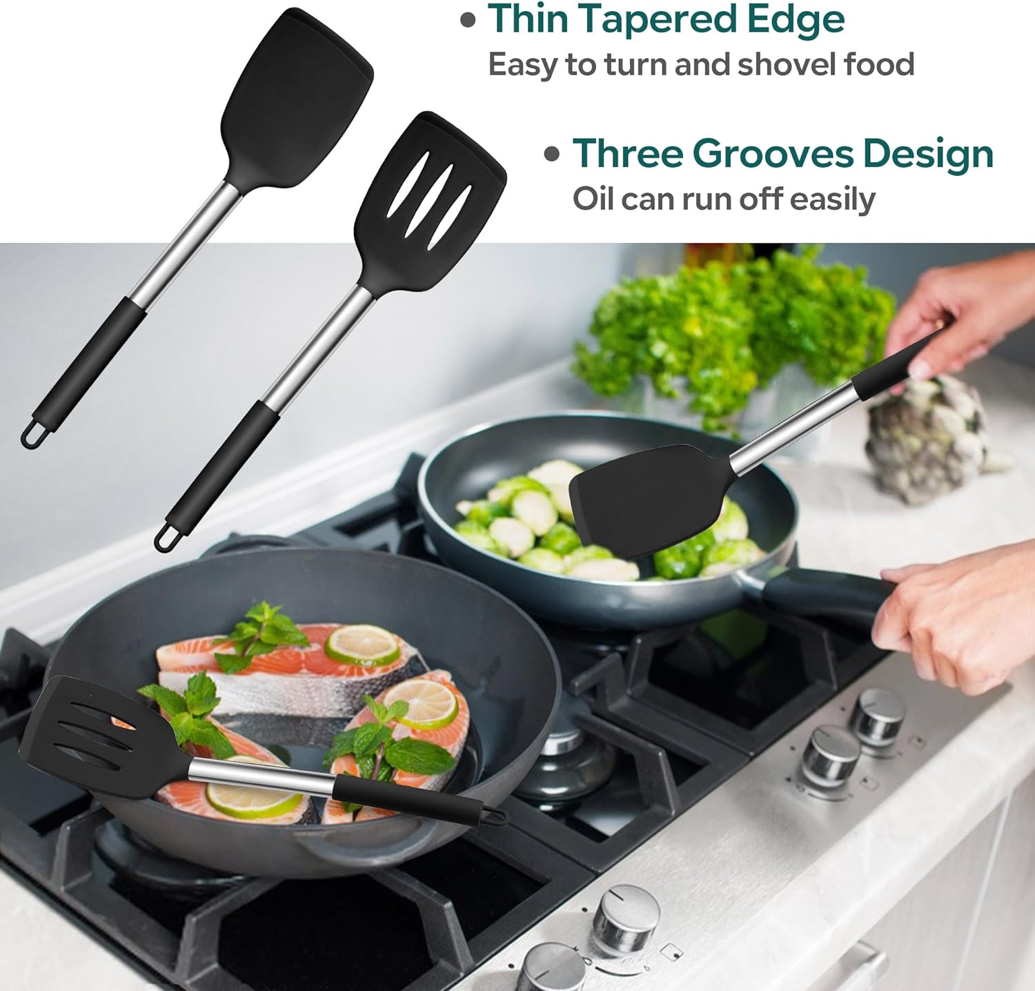 Silicone Spatula, Joyfair Stainless Steel Spatula Pack of 2, Cooking Turner/Non Stick Kitchen Slotted Spatula Ideal for Fish, Eggs, Pancakes, Heat Resistant & Dishwasher Safe, Black