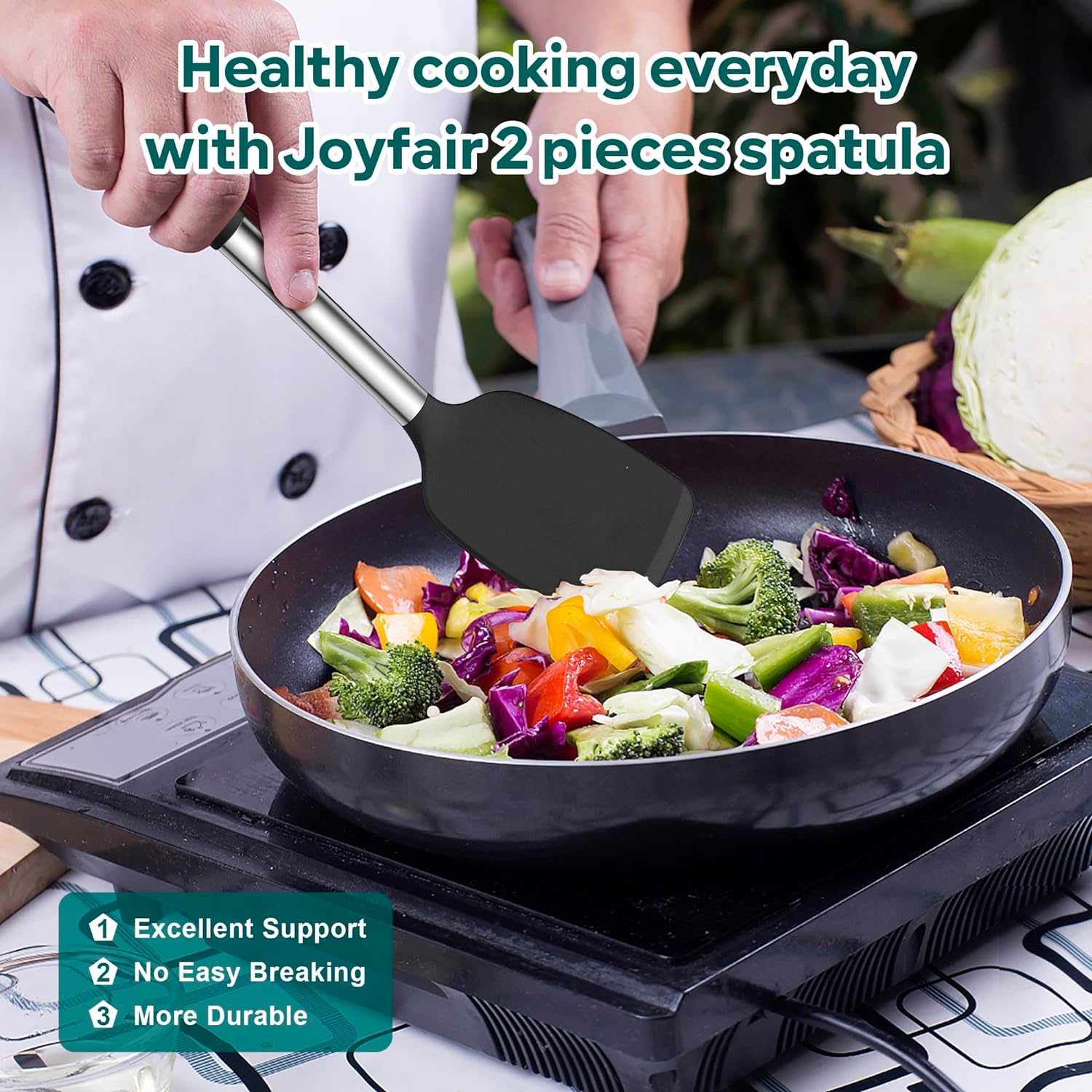 【FOOD GRADE MATERIAL】 Joyfair spatulas for cooking are made of food grade silicone, non toxic and odorless, Less reactive with food, healthy and durable for daily cooking use, One-piece stianless steel core keeps your kitchen utensil away break or rusting, will server you many years, value for your money