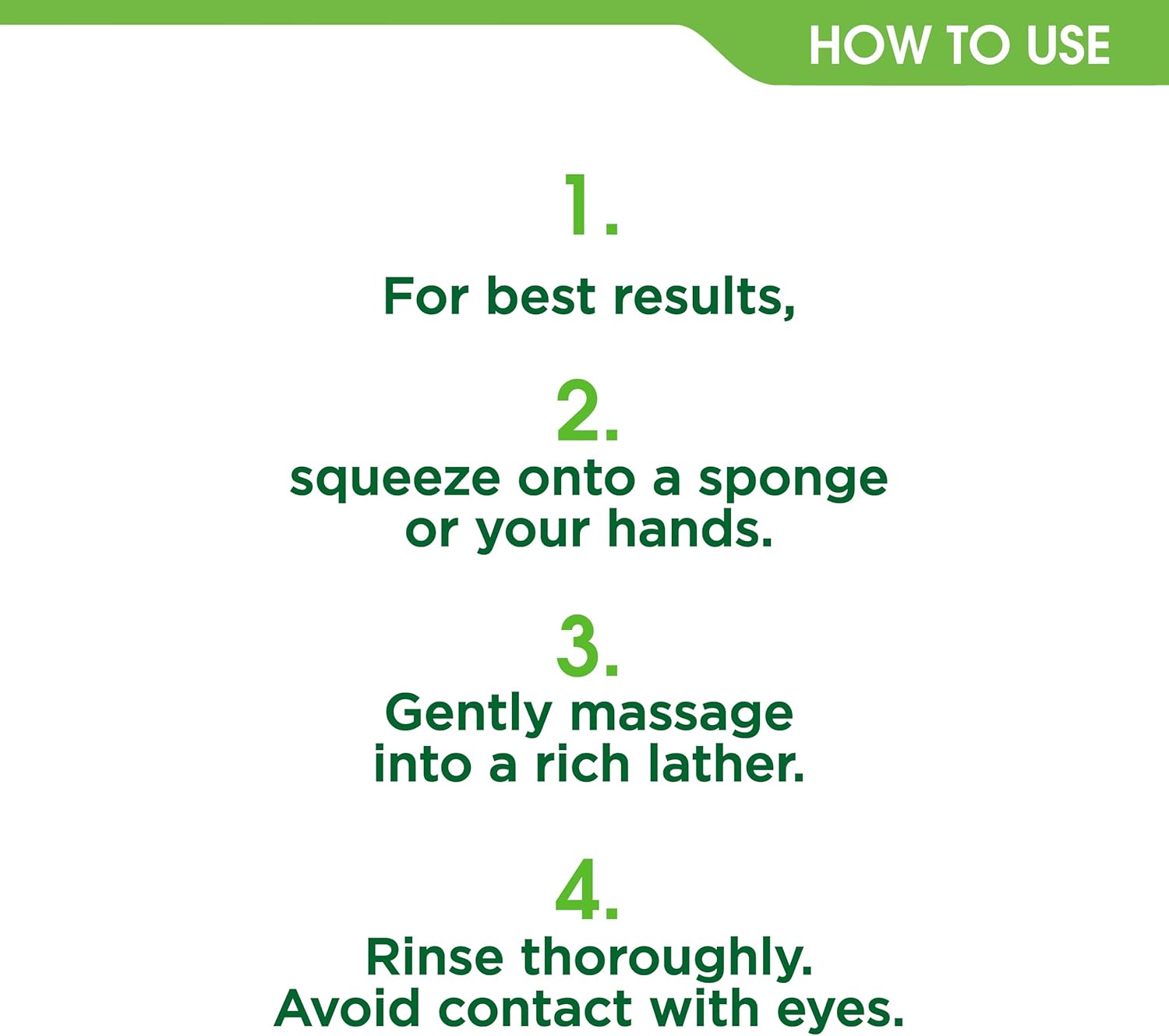 Squeeze our sensitive body wash onto a sponge or your hands. Gently massage over your skin to form a rich lather. Rinse thoroughly. Avoid contact with eyes