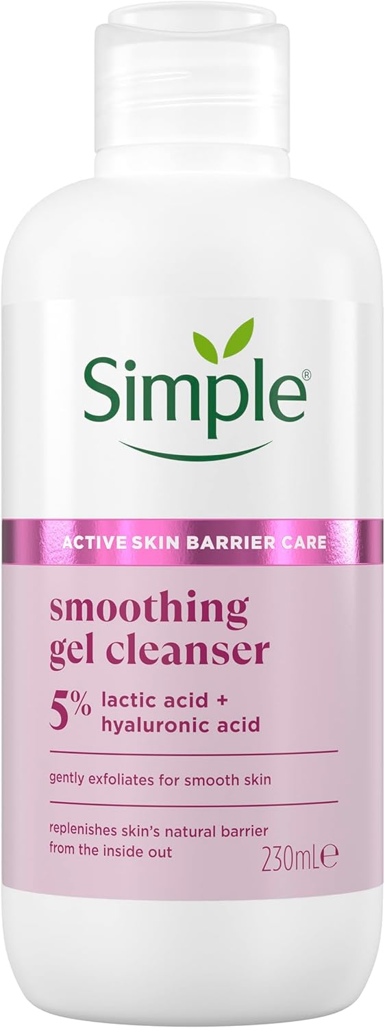 Ready for seriously smooth skin? Meet Simple Smoothing Gel Cleanser, expertly formulated with gentle exfoliants for an instant skin transformation. Powered by 5% Lactic Acid and Hyaluronic Acid to renew and resurface dull skin, this gel-to-foam exfoliating facial wash lathers up to deeply cleanse while locking in skin-smoothing hydration. But it doesn’t stop there. This ultra-comforting face cleanser is boosted with Ceramides to support the skin’s natural ceramide production and repair its moisture barrier, nourishing it with everything it needs to stay healthy and plump. Thanks to the double-action blend of dirt-busting Micelles and Amino Acid Cleansing Clusters, it thoroughly (but mildly) lifts away all traces of make-up, pollution and dead skin cells without stripping away essential moisture. The result? Instantly smoother, satisfyingly clean, touchably soft and hydrated skin. To boost your daily routine, squeeze a small amount of Simple Smoothing Gel Cleanser into your hands and massage onto damp skin. Rinse, pat dry and follow with your favourite Simple serum and moisturiser to lock in the goodness. Like all Simple products, this facial cleanser is dermatologically tested and hypoallergenic and contains no artificial perfume, colour or harsh chemicals that could upset your skin. Kind to all skin types (even sensitive skin), the formula is 100% sulphate free and soap free, 98% bio-degradable and packaged in a recyclable bottle.
