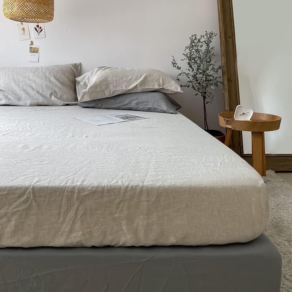 Simple&Opulence Fitted Sheet 35cm Deep Pocket-100% Pure Natural Linen Plain Mattress Protector Bed Sheet-(Linen,Double 137x190cm)