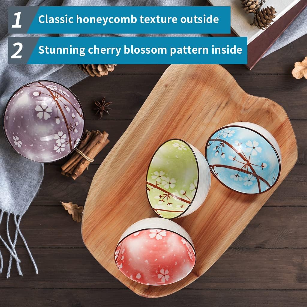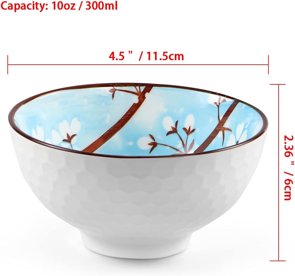 Skelang Ceramic Serving Bowls, Rice Bowl with Gift Box, Japanese Style Pottery Bowls, Porcelain Serving Bowls for Rice, Soup, Dessert, 10oz/300ml, Set of 4 (Cherry Blossom Pattern)