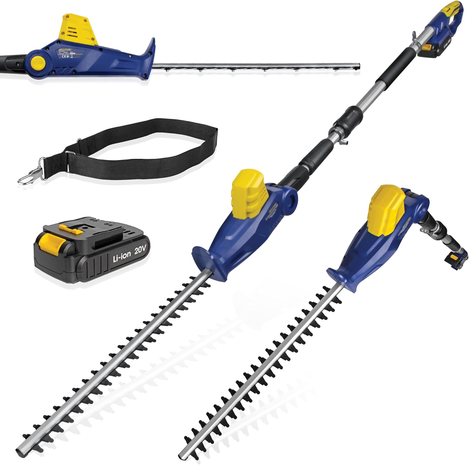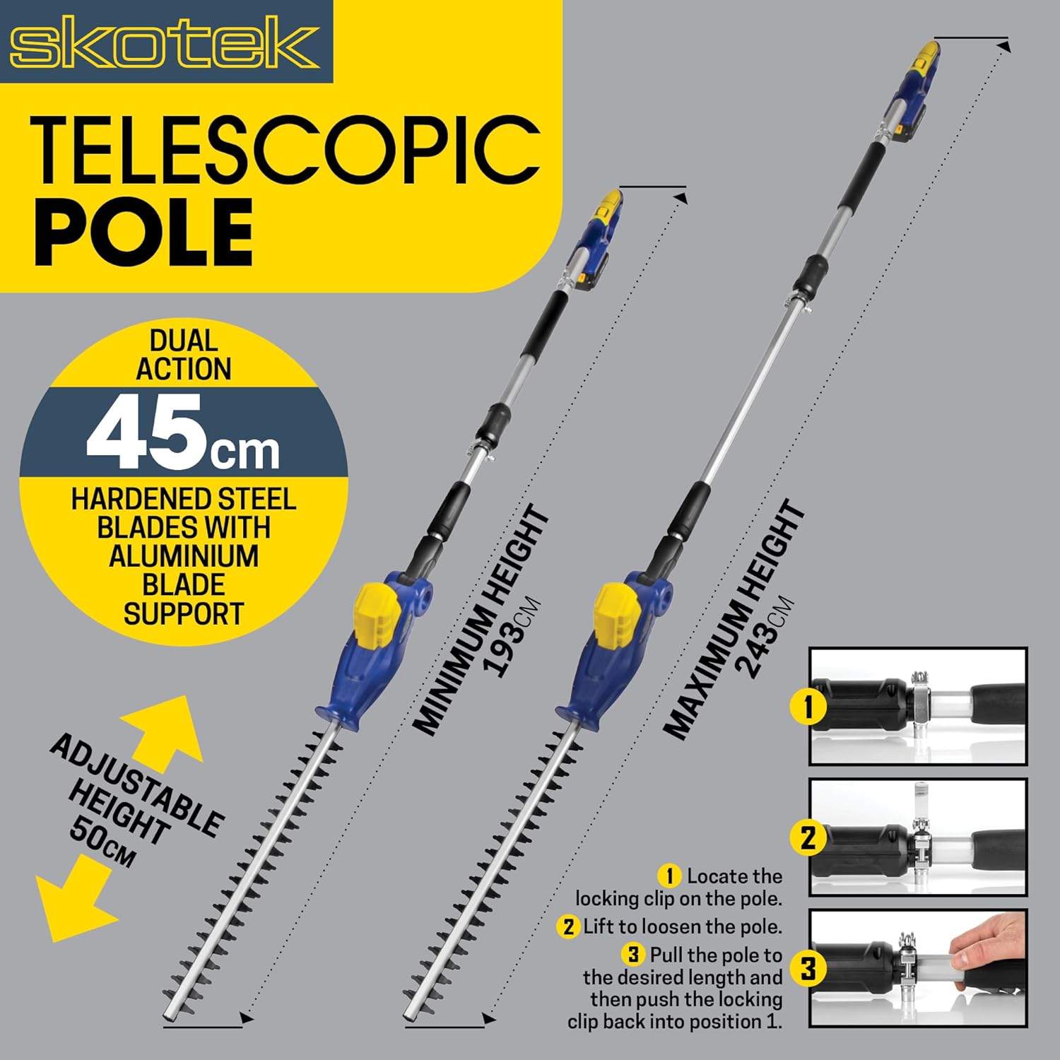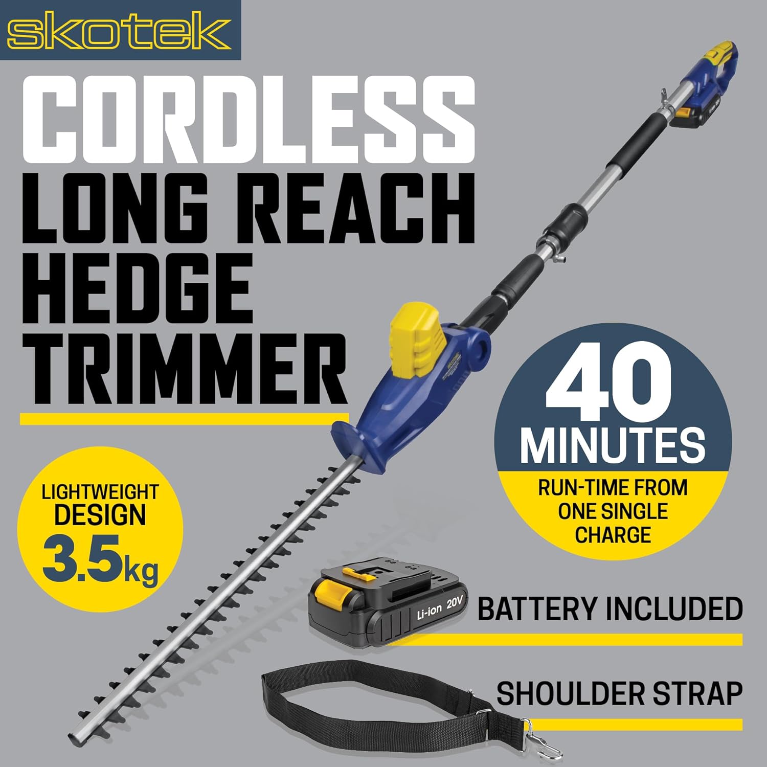 Skotek Cordless Long Reach Hedge Trimmer, 20V Lithium-Ion 2.43m Telescopic Hedge Trimmer Cordless Hedge Cutter with 1x Battery, Shoulder Strap and Charger Included