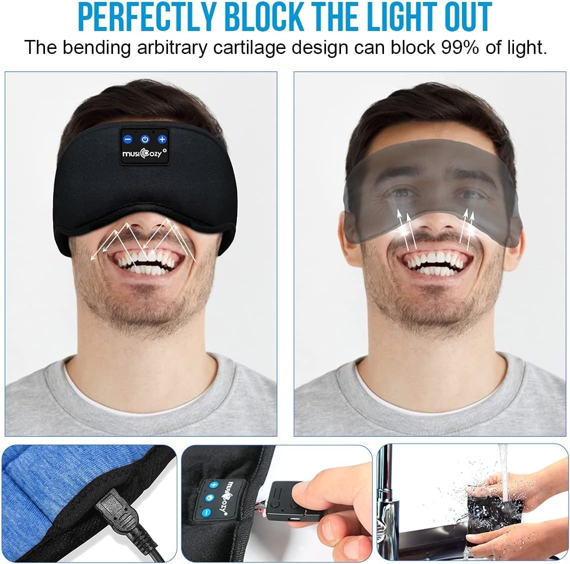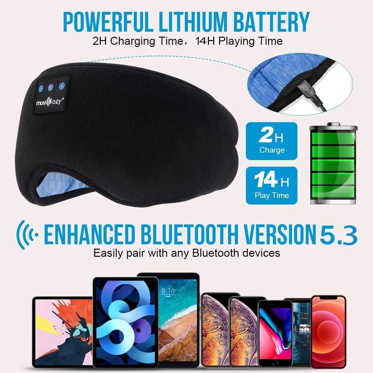 🔋🎼【Powerful Cobalt Battery】MUSICOZY definitely deserved the most advanced Bluetooth sleeping eye mask in the market,the Sleeping mask headphones adopts upgraded battery chip which provides 10-14+ hours music playback, You can choose your favorite music to aid you fall asleep quickly, enjoy uninterrupted high -quality sleep all night!