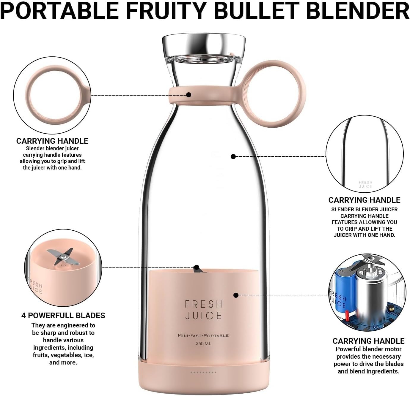 Smart Cleaning : Our mini blenders are easy to clean by removing blades and bottle caps and makes the electric personal blender’s cleaning process a breeze. Just pour some water and an optional drop of soap into the blender bottle, and you need to double click the ON/OFF button to start automatic cleaning until it is clean.