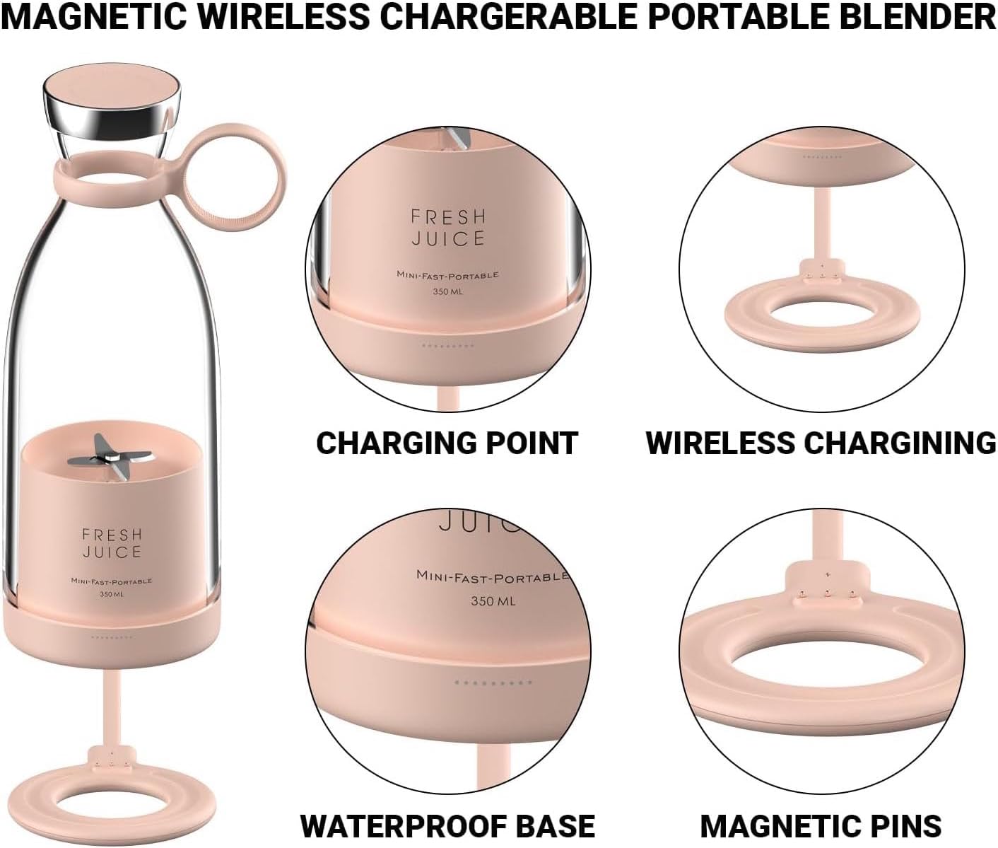 What You Get : Product includes 1*portable juicer made up stainless steel having 1*USB cable, 1*user manual, 1*blender bottom cap and a Charging Base which includes Work Switch and Magnetic Charging Contacts.