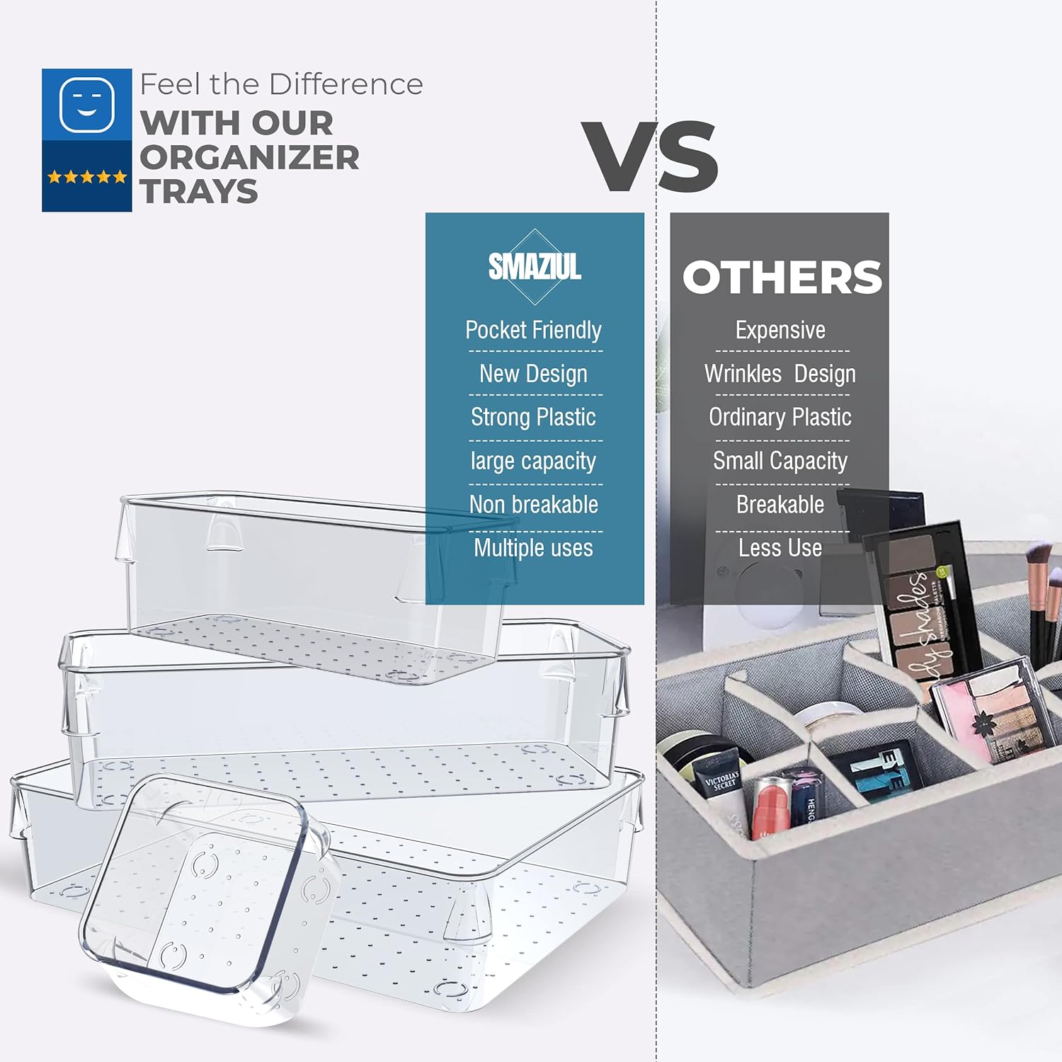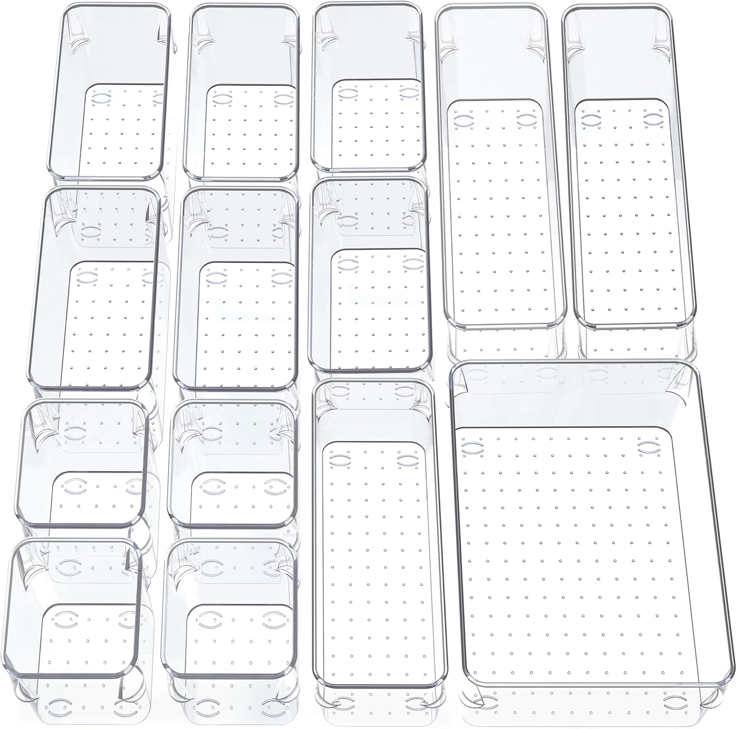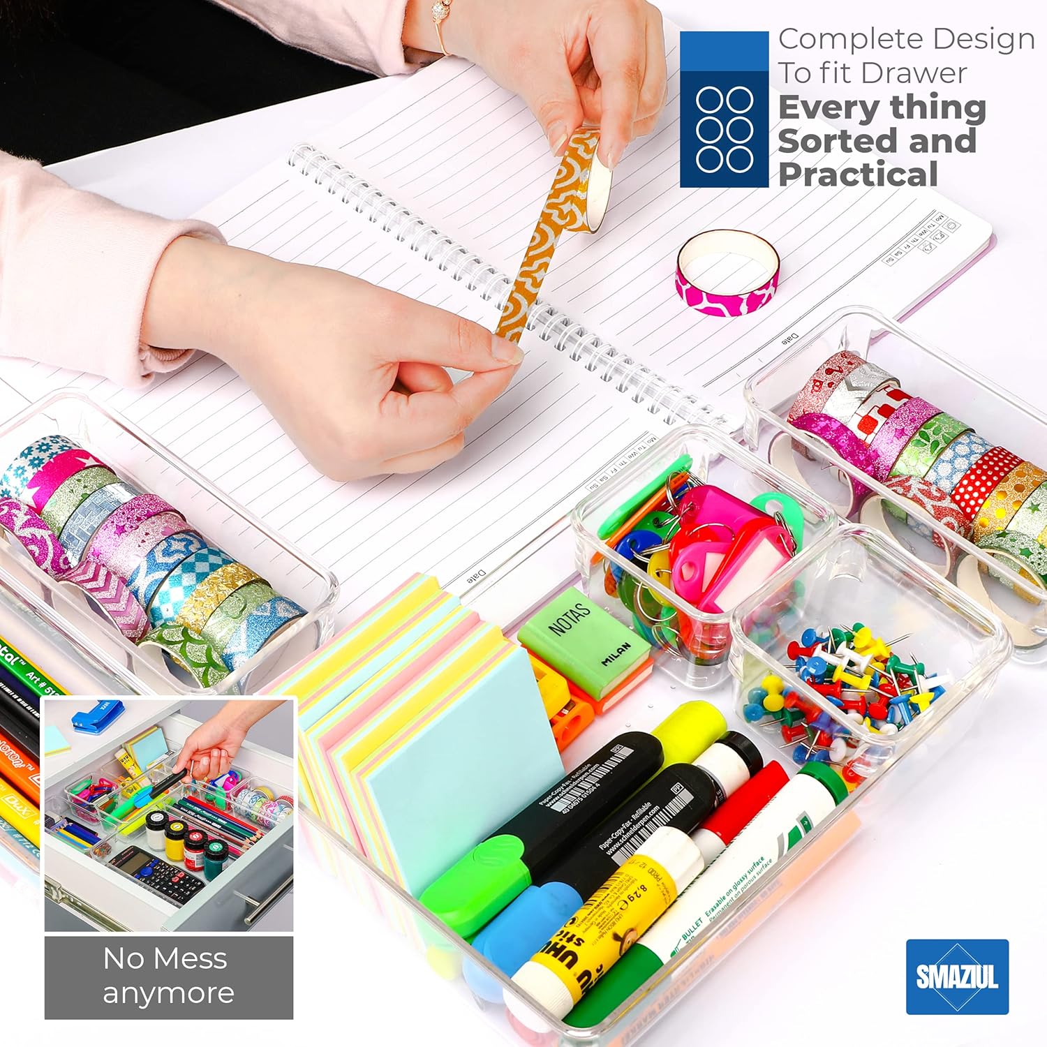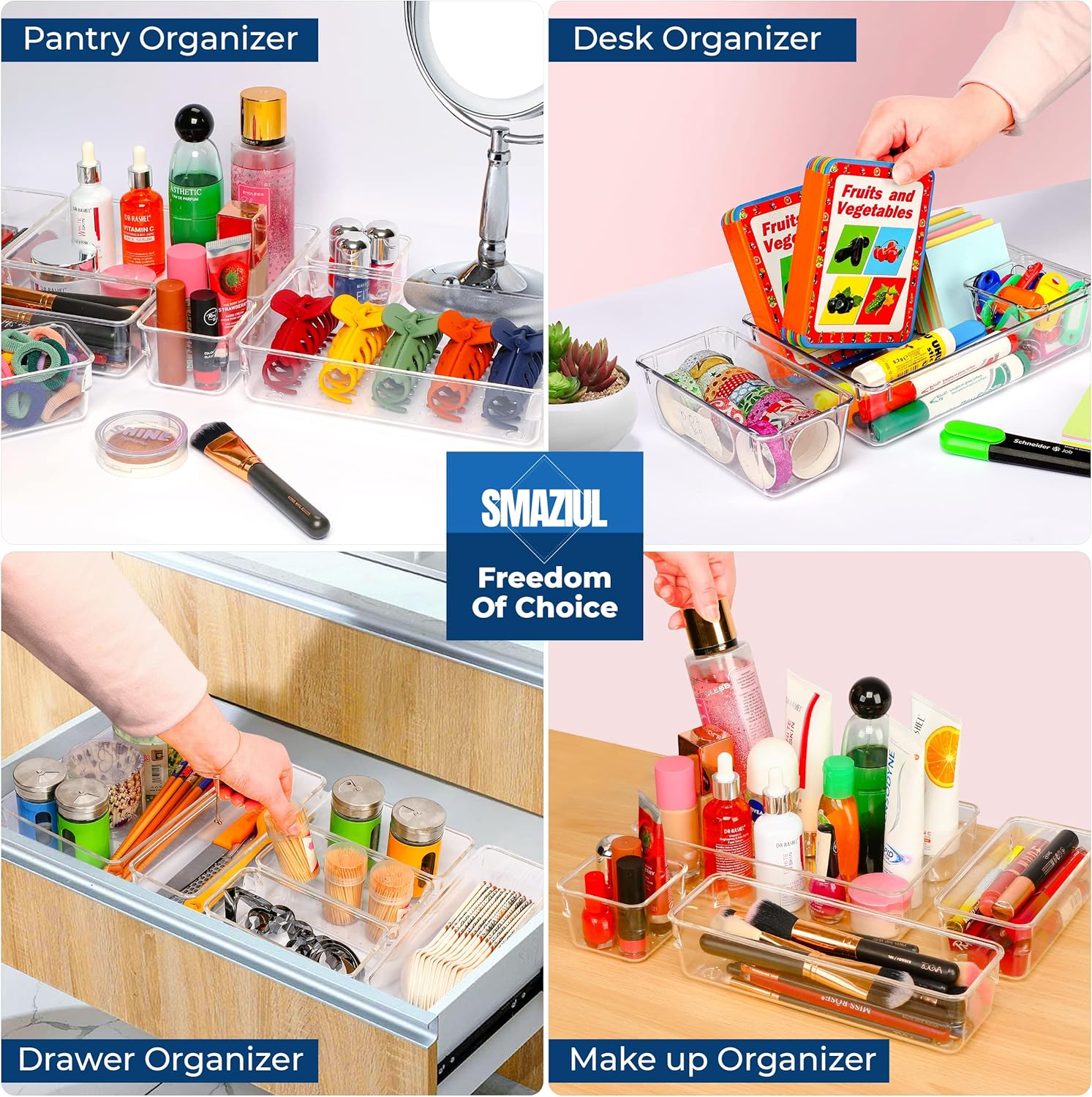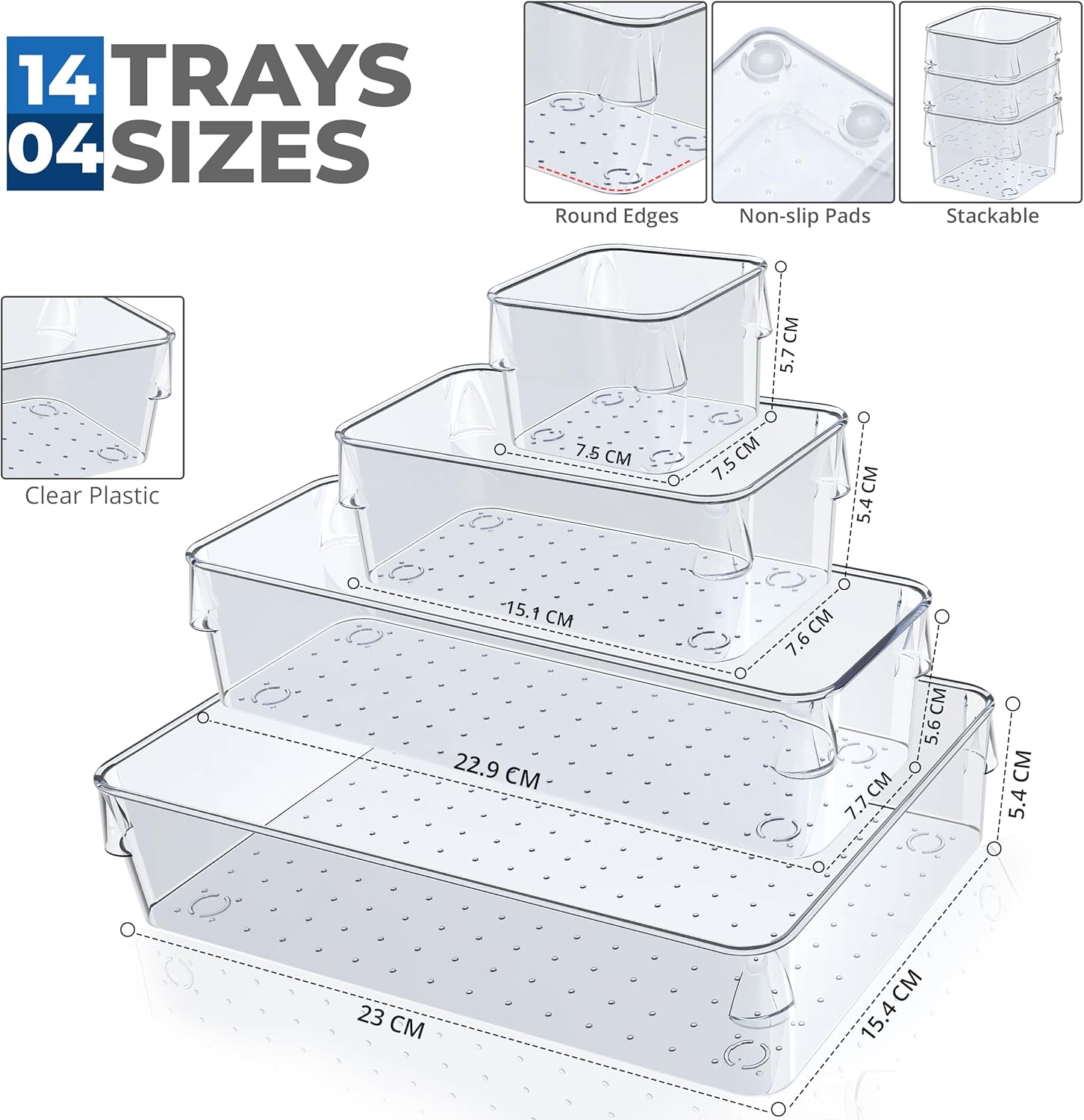 Smaziul 14 Pcs Clear Drawer Organiser with 4 sizes Desk Organizer ideal for organizing, cosmetics, makeup, jewelry, office supplies, bathroom accessories & much more