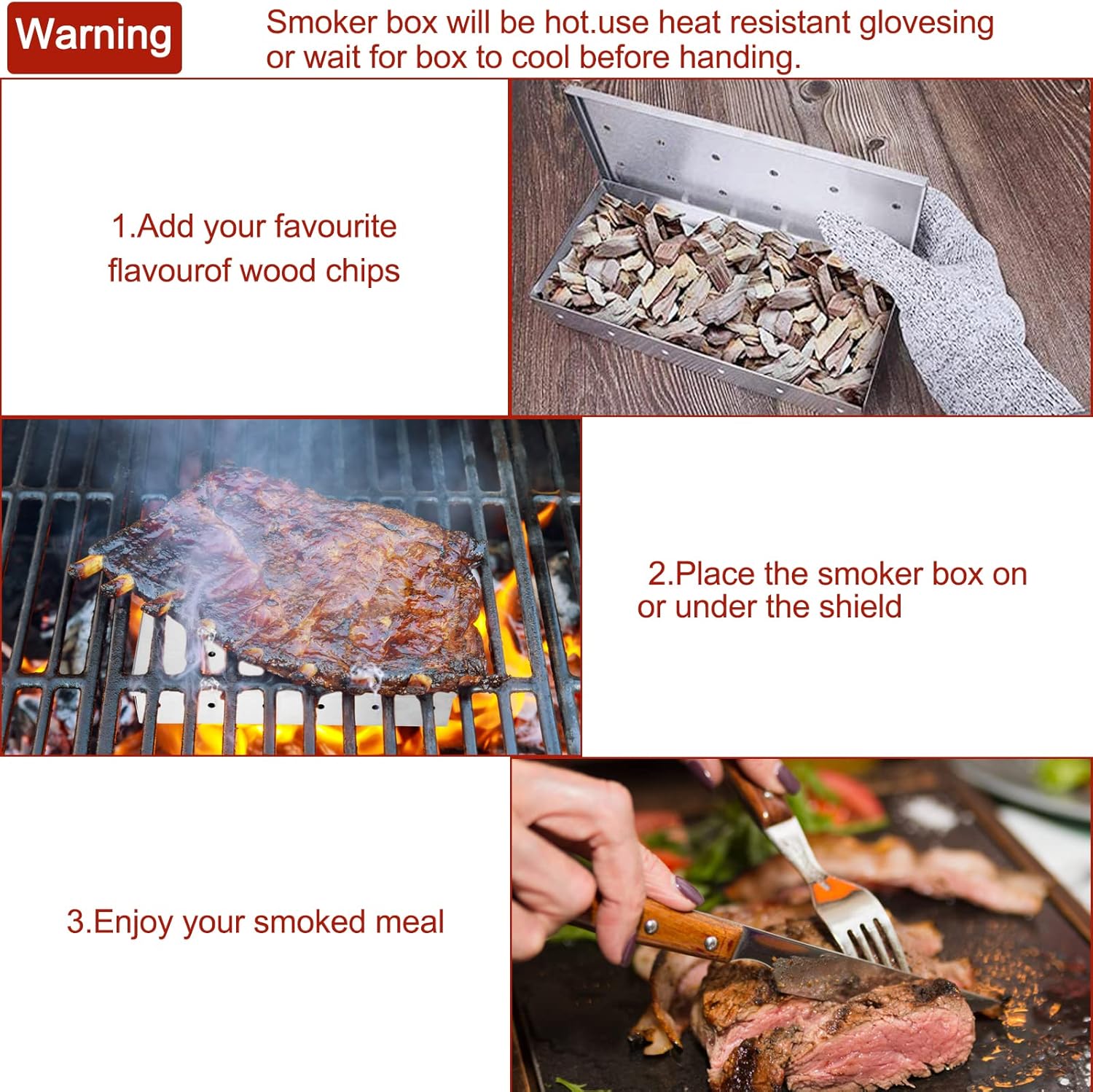 Add Great Smoky Flavor for BBQ:Just fill some wood chips to smoker box and light the smoke,enjoy your BBQ with delicious smoky aromas,make the food more mouthwatering!