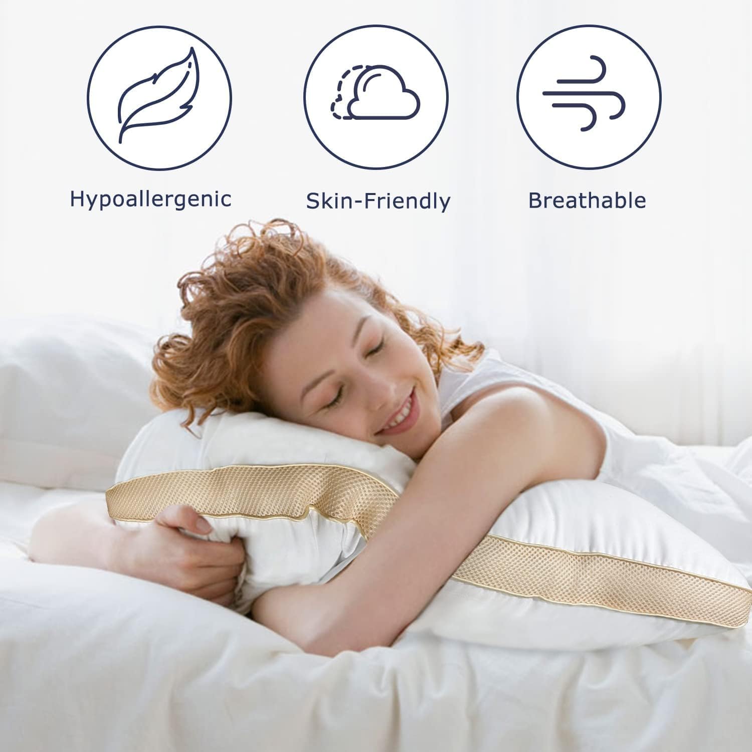 HOTEL QUALITY PILLOW – Each part of pillows are made from selected top quality material for your higher sleeping quality. Breathable mesh gusset not only add spot on its’ look, the most important function is hold its’ fluffy shape, won’t go flat after long-term use. We care every inch details that can optima your confortness.