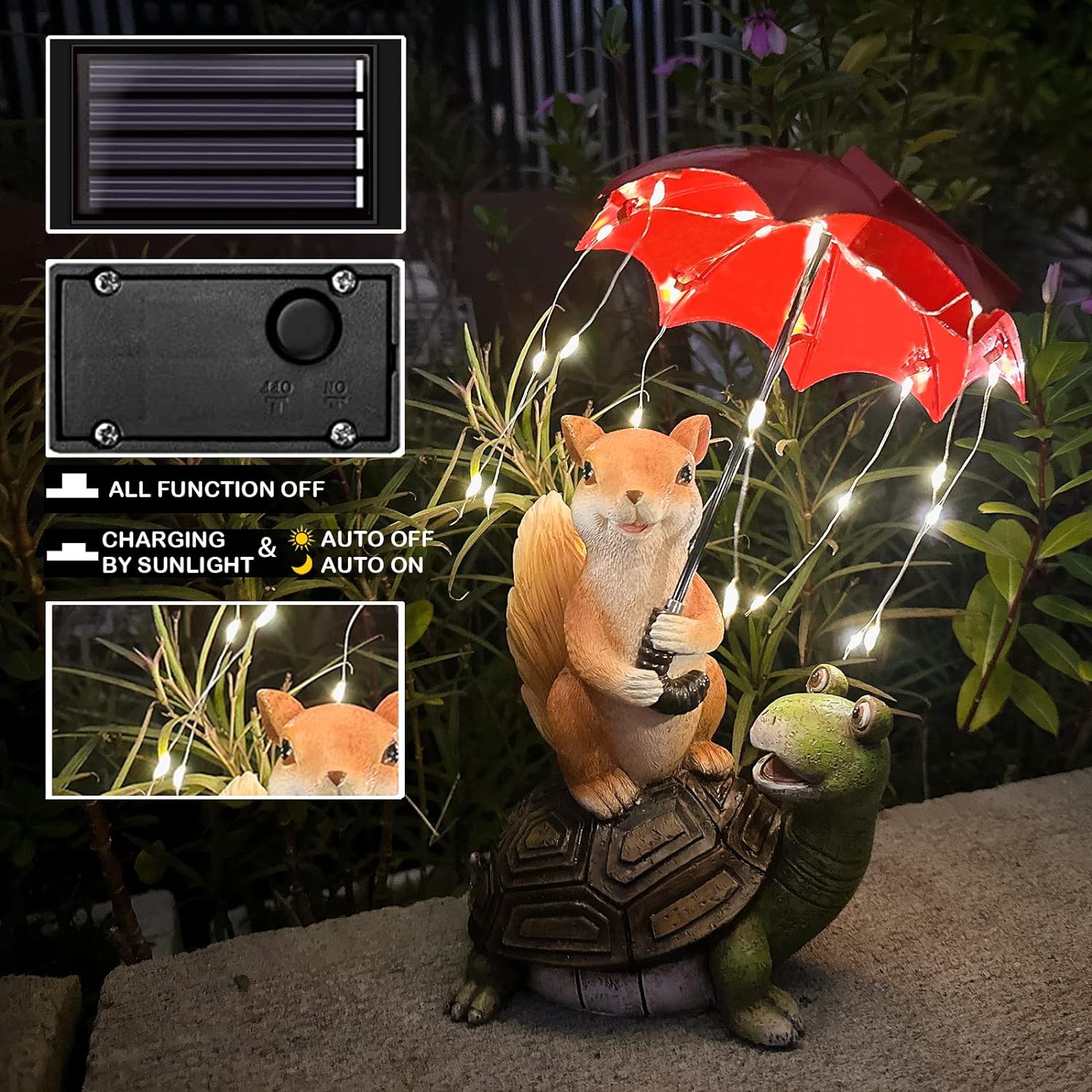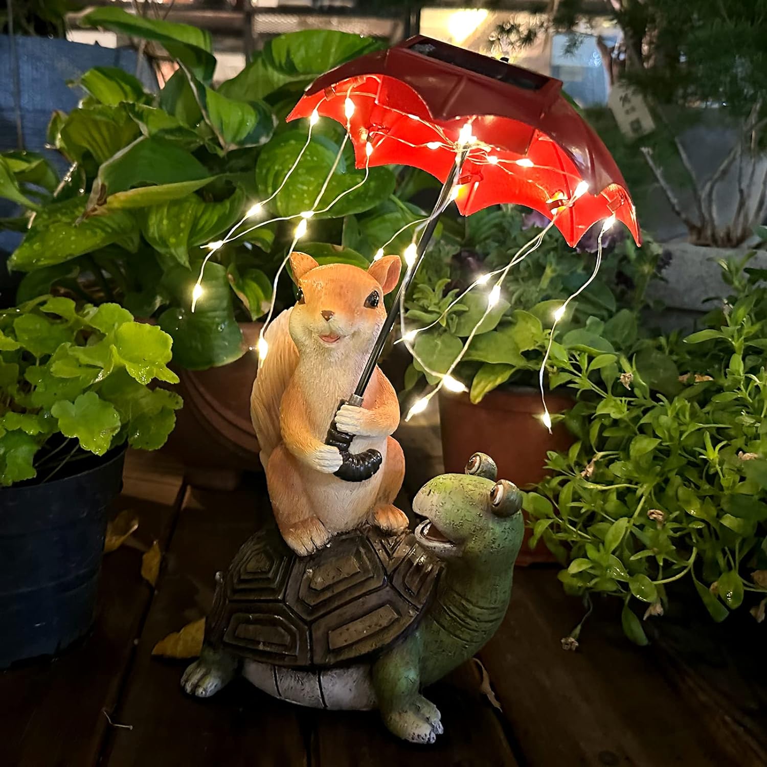 🐢🐿【Fairytale Design】- This outdoor solar statue depicts a squirrel sitting on the back of a turtle holding an umbrella with 8 strands of LED light lines, full of fairytale ambience, bringing fun to your garden.