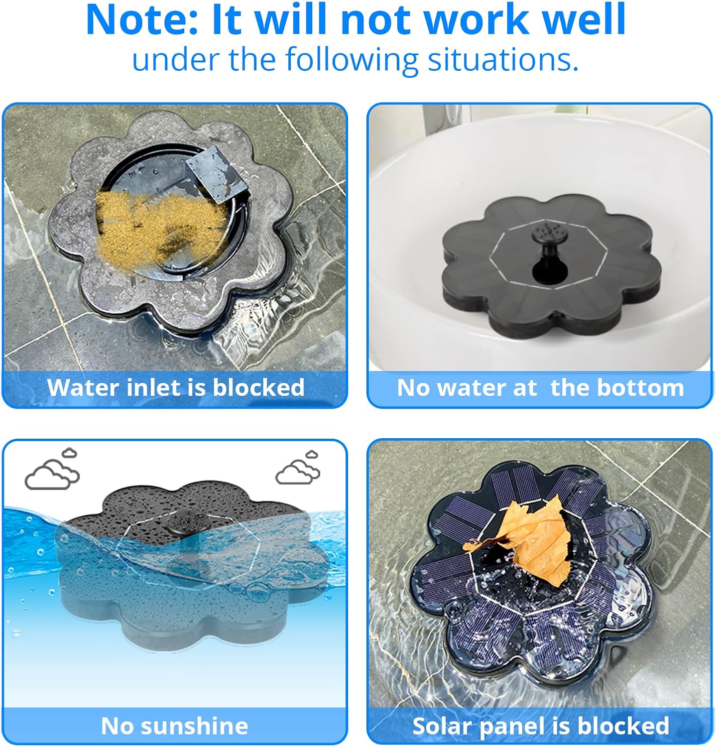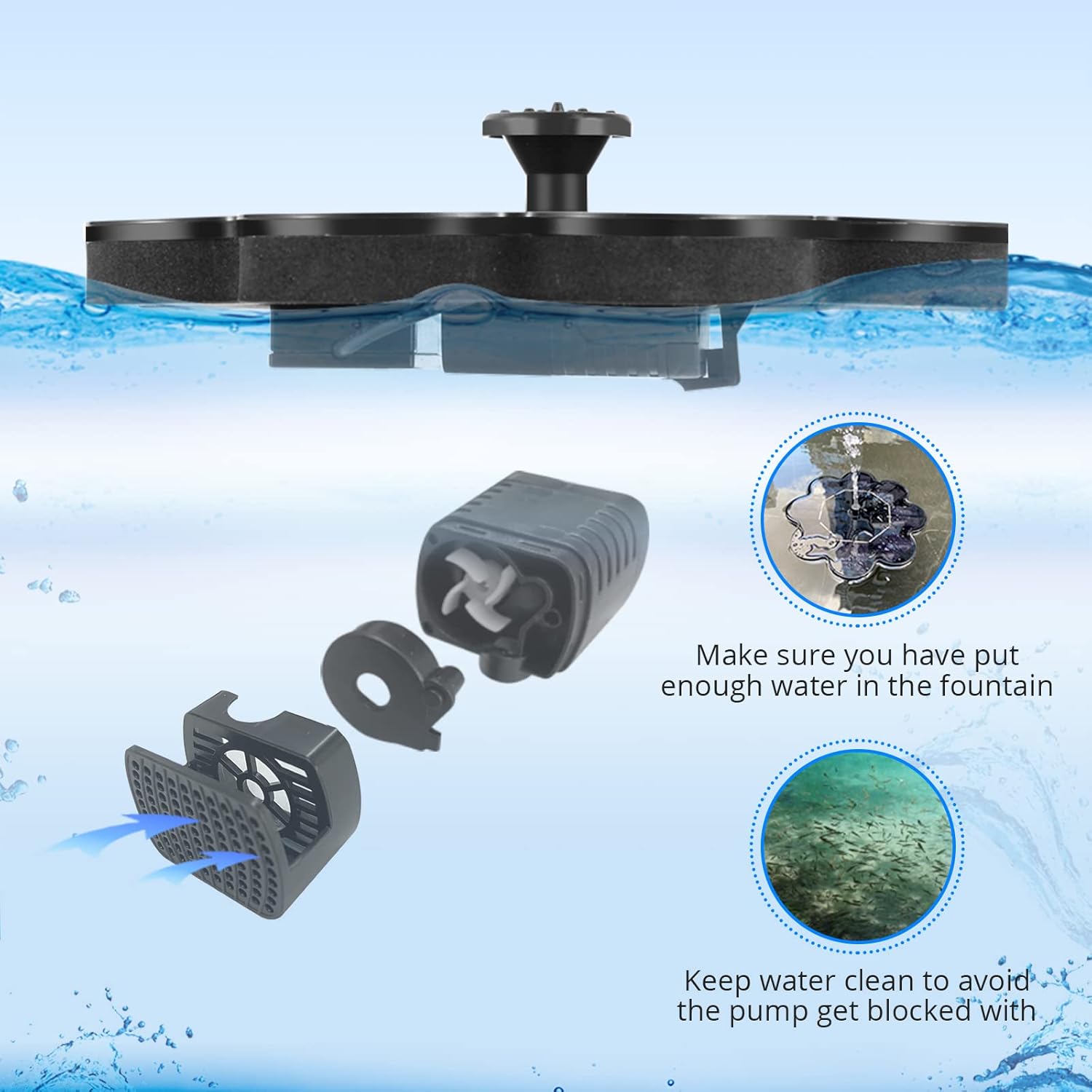 【Easy to Use and Clean】Simply place the solar fountain pump in a birdbath or small pond in direct sunlight and the solar fountain will float on the water and start working. Remove the nozzle periodically and clean it easily to ensure a wonderful spraying effect.