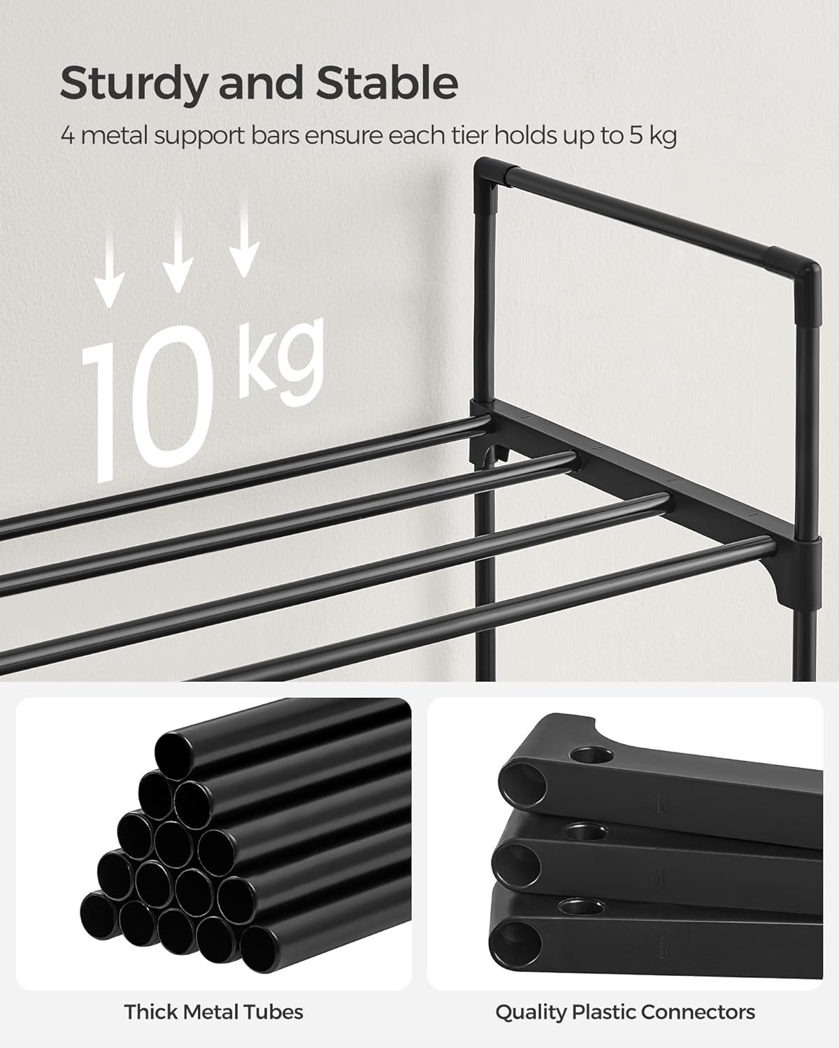 [Sturdy and Durable] Thick metal tubes connected by quality plastic connectors make a sturdy shoe shelf. Each tier supports up to 5 kg, giving your shoes strong support