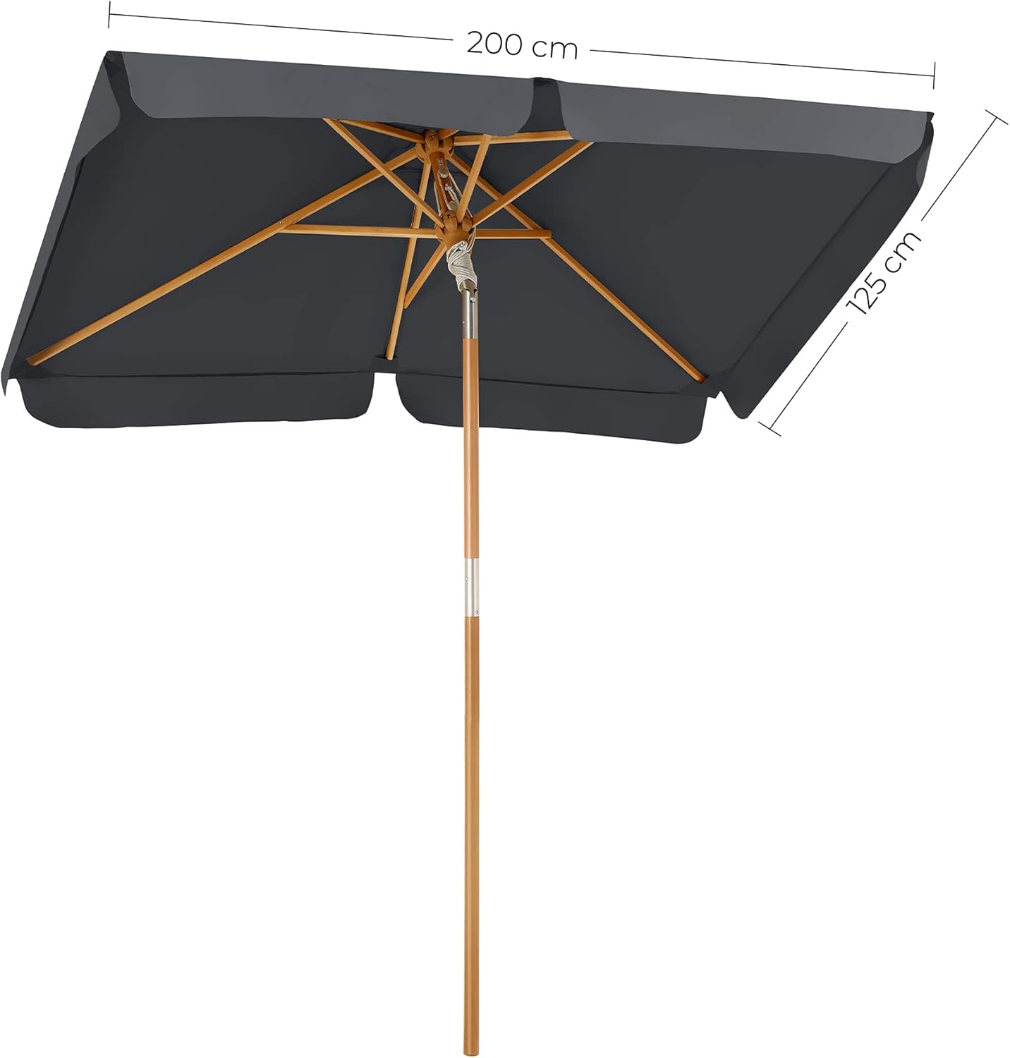 SONGMICS Balcony Umbrella, 2 x 1.25 m Rectangular Garden Parasol, Sun Protection, Wooden Pole and Ribs, Tilt Mechanism, Base Not Included, for Patio Outdoor Garden Terrace, Grey GPU26GY