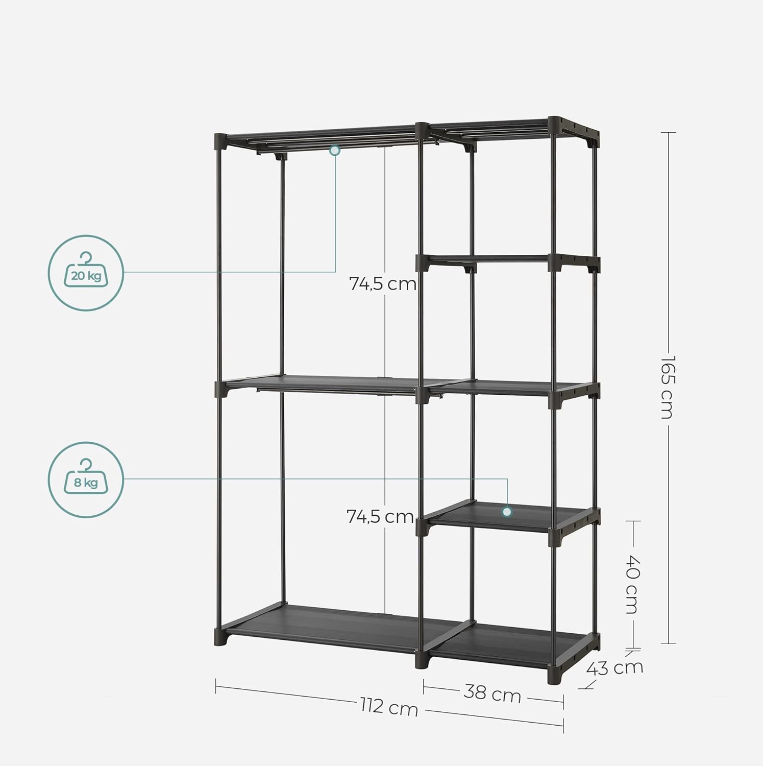 Colour: BlackMaterial: Non-Woven Fabric, Metal Tube, Plastic ConnectorProduct Size: 112 x 43 x 165 cm (L x W x H)Product Weight: 5 kgMax. Static Load Capacity per Layer: 8 kgMax. Static Load Capacity of the Hanging Rail: 20 kgOverall Static Load Capacity: 80 kg