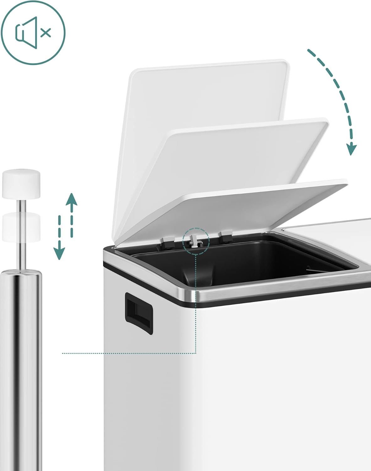 Recycling Can Be Easy: With 2 sections side by side, you can sort your recycling and trash with a simple toss. All you need to do is to step on the pedal to open the lid, and you now have your hands free to throw away your trash or recycling. Without needing to touch anything with your hands, it’s more hygienic. The 2 buckets inside have handles so that they can be easily lifted out and emptied.Puppy- and Kid-Proof: If you get tired of cleaning up the mess that your naughty husky or kid leaves you after they overturn the garbage basket, then this sturdy bin with lids is perfect for you – it can’t be opened without first using the pedal.Specifications:Colour: White Material: Steel, PP Plastic Inner Bucket, ABS Plastic Lid Total Product Size: 58.5 x 32 x 54.5 cm (L x W x H) Each Inner Bucket Size: 27.5 x 26.5 x 48 cm (L x W x H) Total Height with Lid Open: 83 cm Product Weight: 7.5 kgPackage Contents:1 x Rubbish Bin1 x Instructions (EN, DE, FR, ES, IT)SONGMICS Notes:Wipe clean with a damp cloth and then wipe dry.