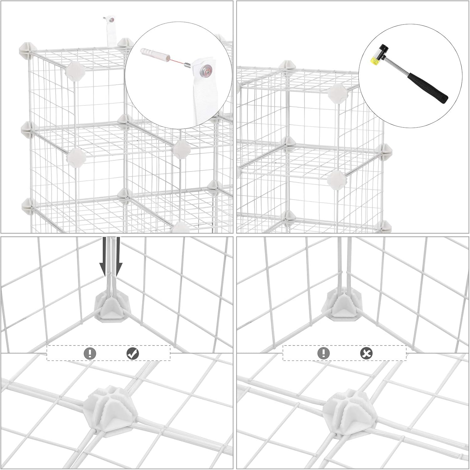 The product can only be customised into the configurations within the limits of included connectors and panels.The product can only be customised into the configurations within the limits of included connectors and panels.This product can be assembled into different forms but only within the limit of the included parts.Do not place the item outdoors for extended periods of time to avoid weathering.Keep the round edge with the “SONGMICS” logo of plastic connectors facing outward during assembly.All mesh frame pieces should be pressed to the bottom of the connectors during assembly; after each layer is finished, firmly press each connector to make sure the wire corner reaches the bottom with no gap to add firmness to the structure.