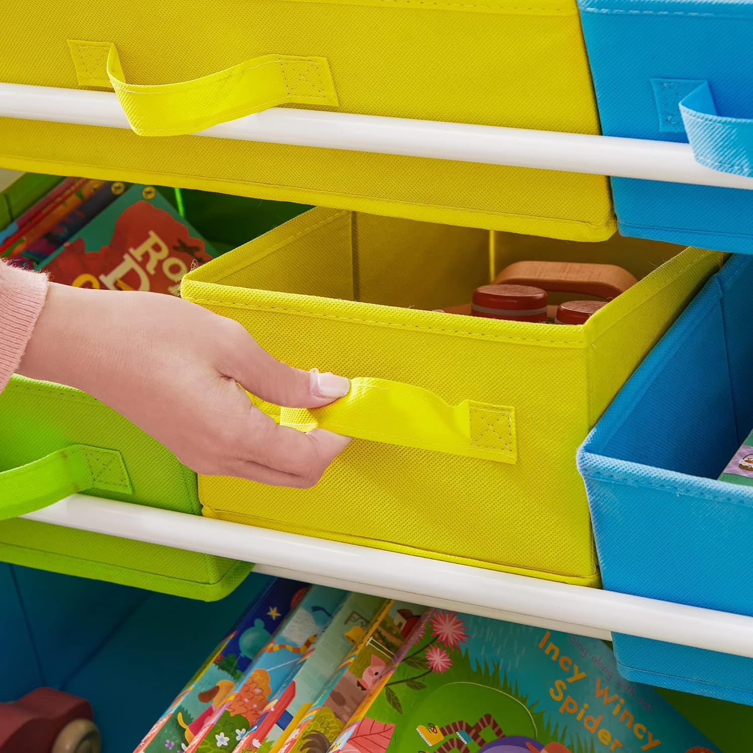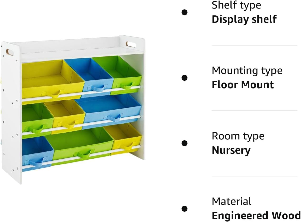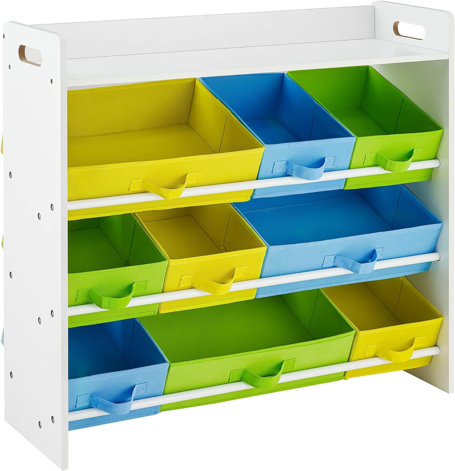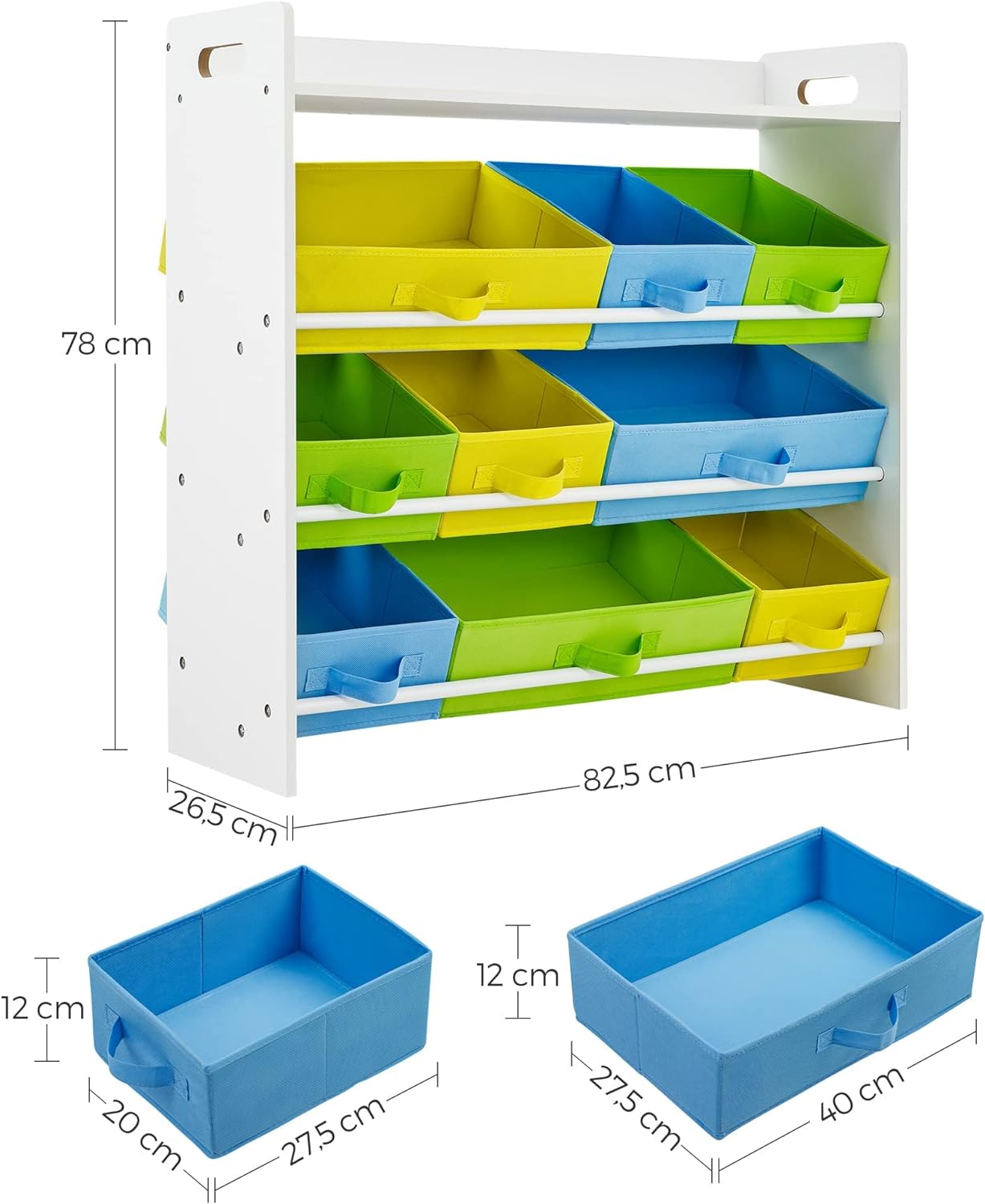 SONGMICS Toy Organiser with 9 Removable Non-Woven Fabric Bins, Kid’s Storage Unit and Bookshelf for Nursery Playroom, Wooden Frame with Shelf, White GKR31WT