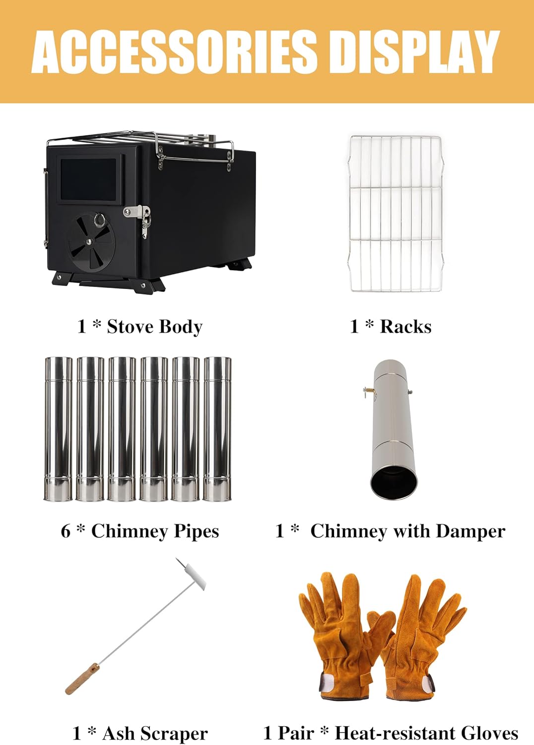 【Tent Stove Kit】- It has 82.7″ total height with flues to ensure suitability for all types of tent or sheds. 1*stove body, 1* racks, 6*sections of chimney pipe, 1*spark arrestor, 1*ash scraper, 1 Pair * gloves.