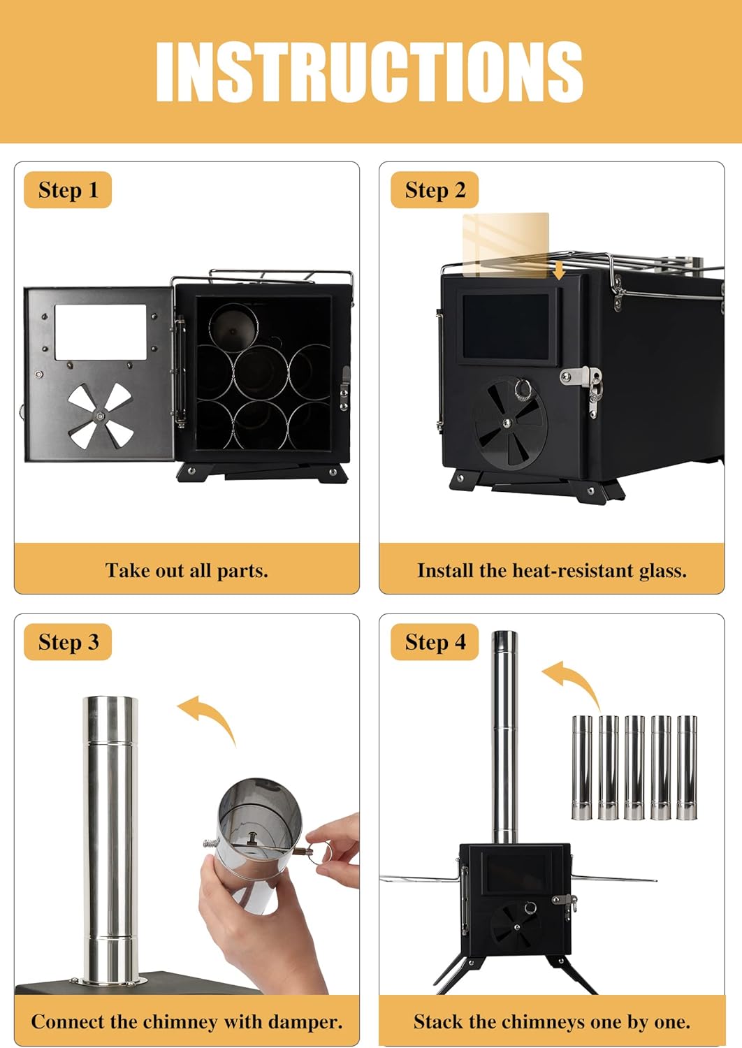 Heat output design: You can adjust or rotate the door damper to adjust the heat output. Help you adjust the heat output. –One of the chimney tubes is equipped with damping tools to manage the flame and burning rate;Quickly fold settings! Easy to place a kettle or cooking pot;It is very suitable for heating or cooking in outdoor camping tents, ice fishing tents, tents, sheds, etc.
