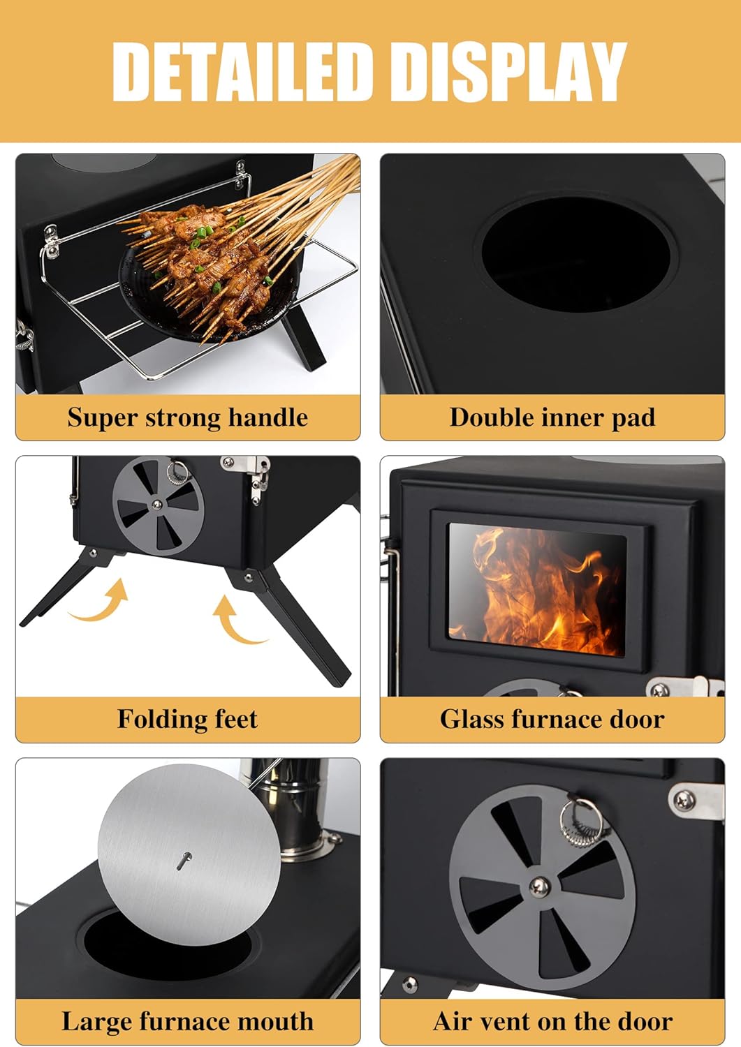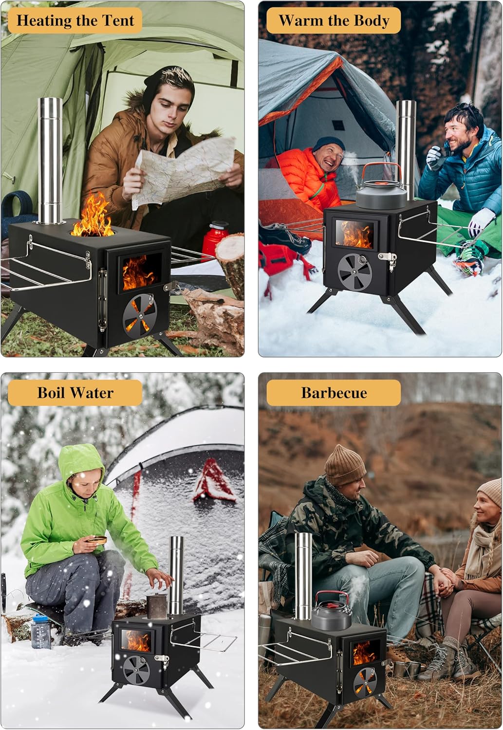 【Sturdy & Stable High Quality Structure】: Durable Steel Frame and High Temperature Resistant Paint are helpful for long time use and help withstand harsh outdoor environment; Provide ample heating surface on top of stove, Which help Make some tasty barbecue, Keep a large tent very warm in below cold conditions, Boil some water. Perfect for camping, backpacking, ice fishing, and hunting trips.