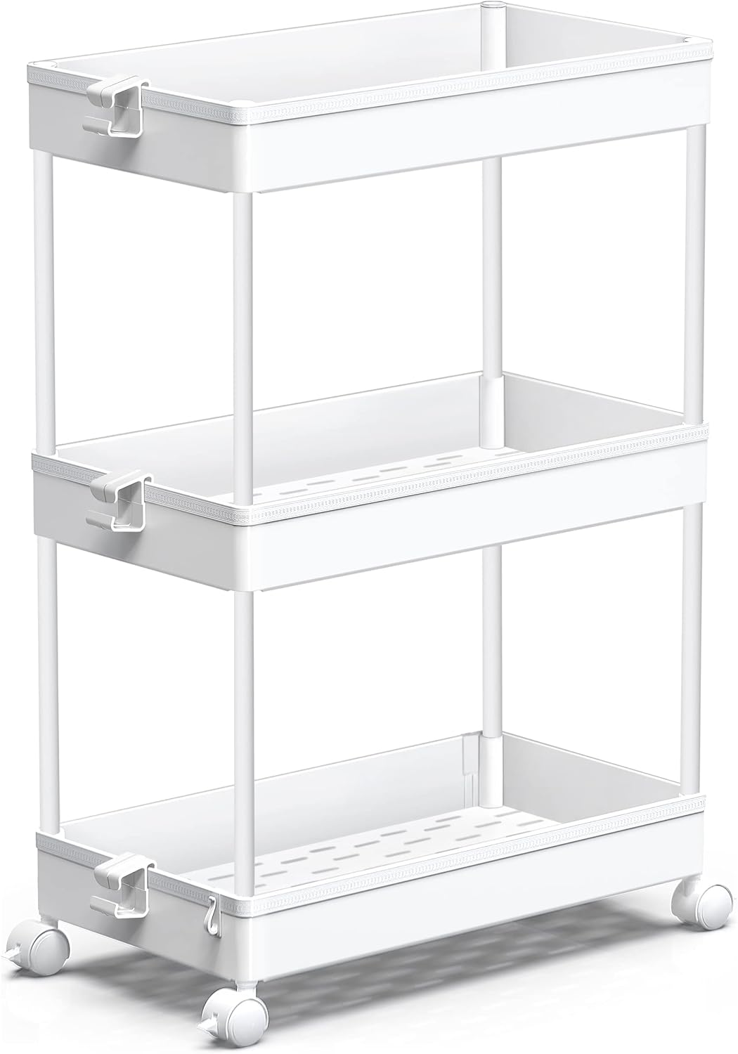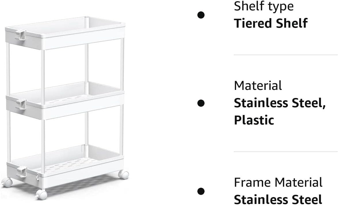 【Large Capacity & Flexible】The 3-tier storage trolley cart is designed perfectly for tight space utilization at home. This rolling storage cart is ideal for closet, kitchen, bathroom, garage, laundry room, office, dorm, libraries or in-between your washer and dryer. Easy to store and transport. Size:22 x 61 x 40 cm.
