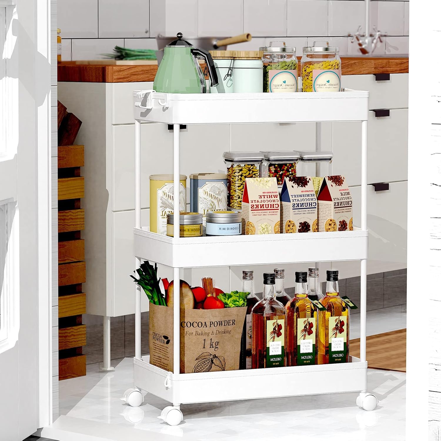 SPACEKEEPER Storage Trolley 3-Tier Slide Out Rolling Utility Cart Shelf Rack on Wheels Multi-purpose Shelving Organizer for Office, Kitchen, Bedroom, Bathroom, Laundry Room & Dressers, White
