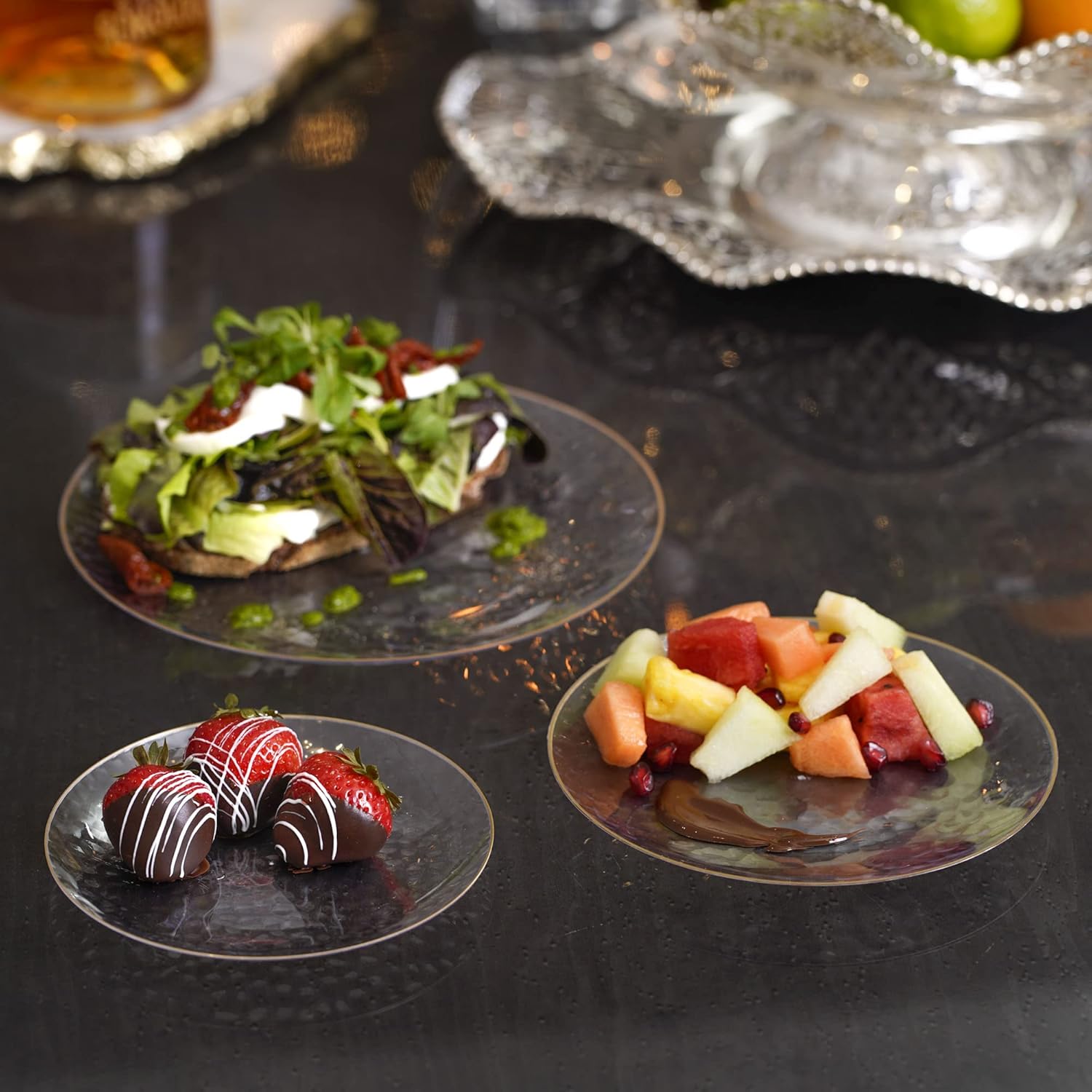 🍥 ➤ Clear plate gold rimmed hammered bread and butter plate set is perfect for home decor and gifts. Use our clear dessert plates year-round, they can be used as dessert plates, cake plate, pizza plate, side plates and so on.