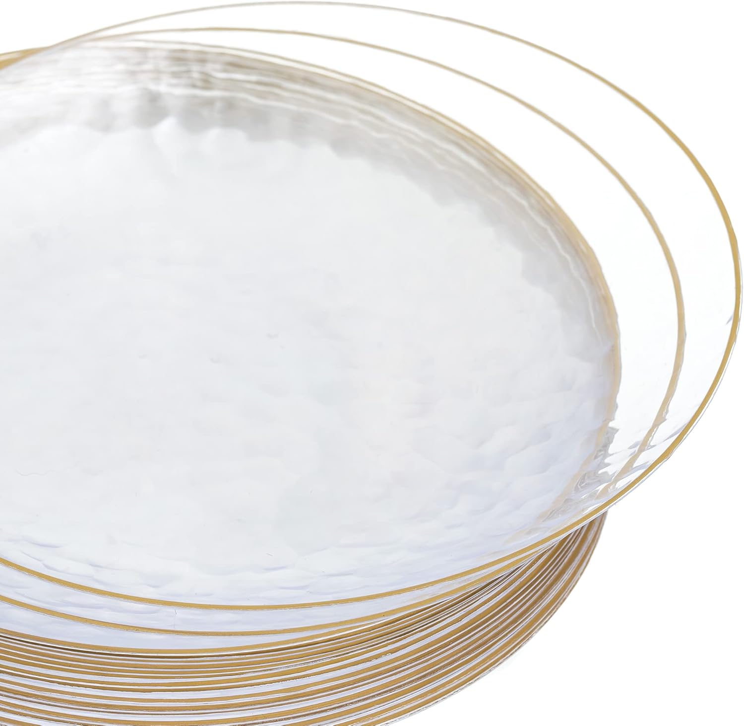 STACKABLES ~ Pack of 20 Party Plates ~ 7″ Hammered Round Clear Plate with Gold Rim ~ Lightweight Elegant Reusable Dinnerware Plates Set ~ Multi Use Salad Bread & Butter Dishes