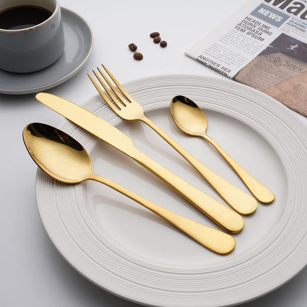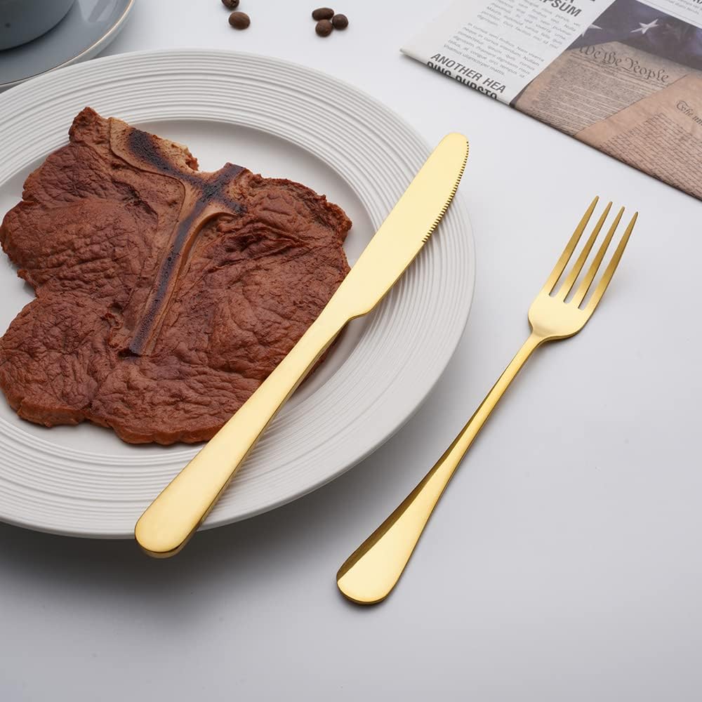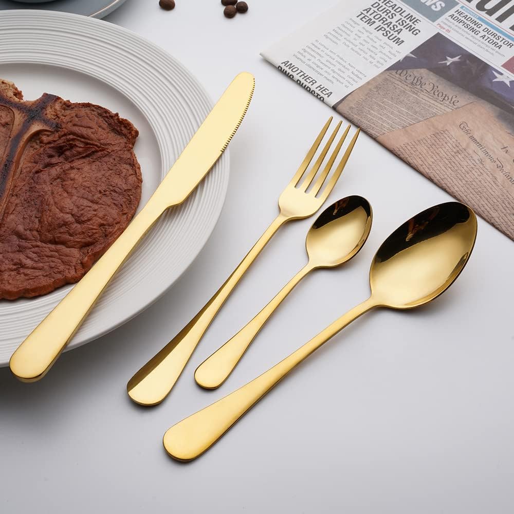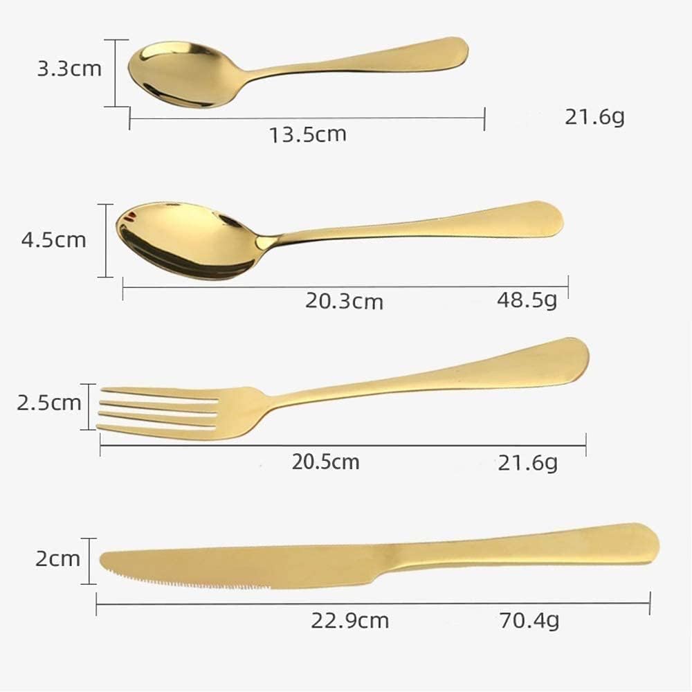 product description Color: Gold Product name: 8-piece golden tableware set Material: (304) stainless steel Style: elegant and simple but not simple style Occasion: kitchen, dining room, dining room, etc. Length: 9 inches (knife) 8 inches (fork) 8 inches (table spoon) 5.3 inches (tea spoon) Weight: 0.155lb (knife) 0.047lb (fork) 0.106lb (table spoon) 0.047lb (tea spoon) The package includes: 2 x table knife 2 x forks 2 x dining spoon 2 x teaspoons Simple and elegant design, without crazy patterns, can be perfectly integrated into any table setting. The ergonomic handle, with appropriate thickness and weight, can ensure a good touch and help you elevate your daily dining to a good dining experience. occasion: Serve friends during weddings, birthdays, steak parties, travel and camping times. Use them in buffets, cafes, cafes, restaurants, parties, barbecues, Christmas, New Year celebrations and all dinners. Luxurious reusable cutlery set can provide you with a good experience. Attention and maintenance: The color will not fall off, it is recommended to wash by hand. With your proper care, the luxury cutlery set may take a long time to use. Do not heat them in the microwave. Do not use hard materials to clean them. If you have any questions, please contact us via email 🙂