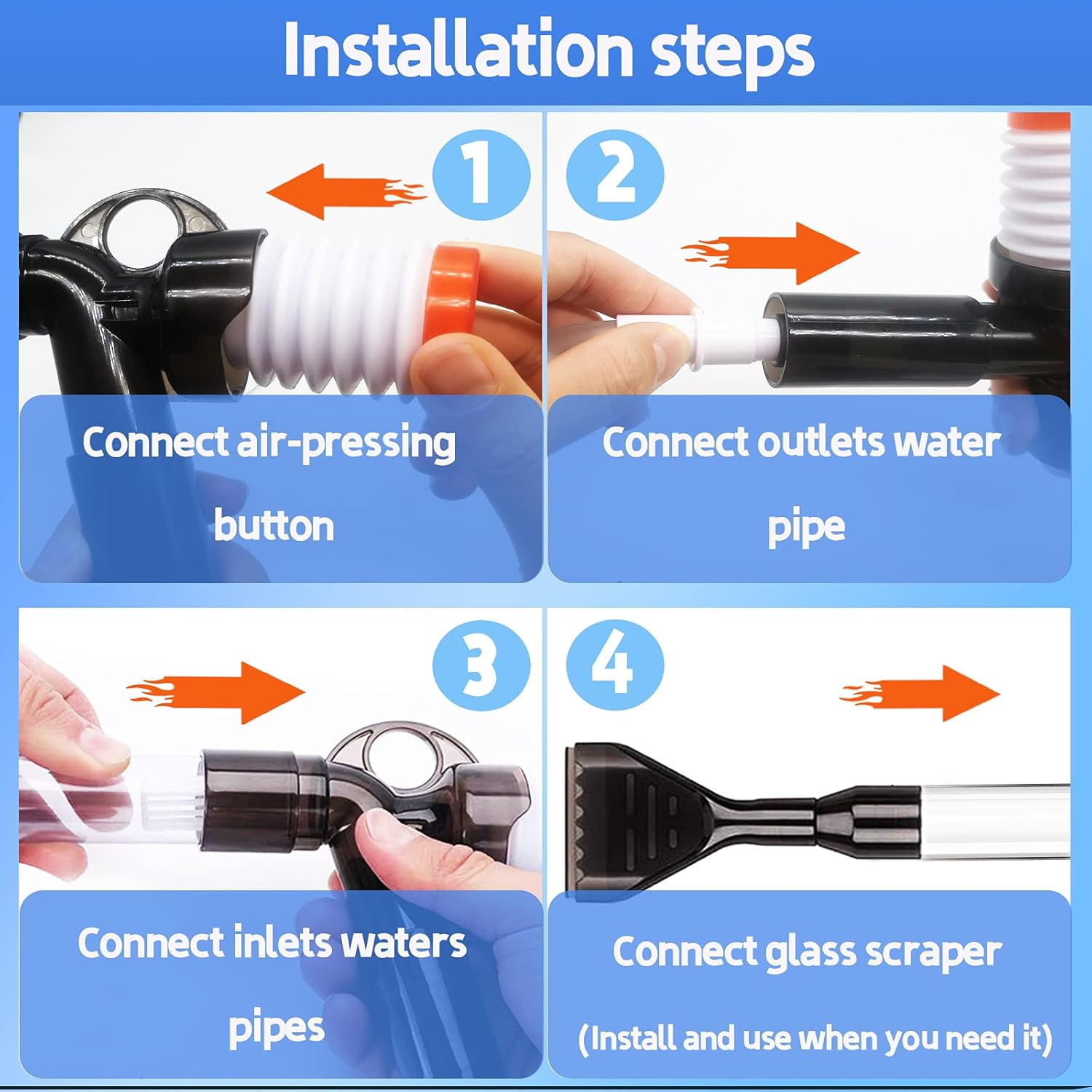 【Scope of Application】Aquarium water changer is suitable to fish tanks of different sizes. We are equipped with 2 water inlet pipes, which allow you to assemble and use according to the size of the fish tank, which is very flexible. Aquarium gravel cleaner is perfect for up your aquarium.