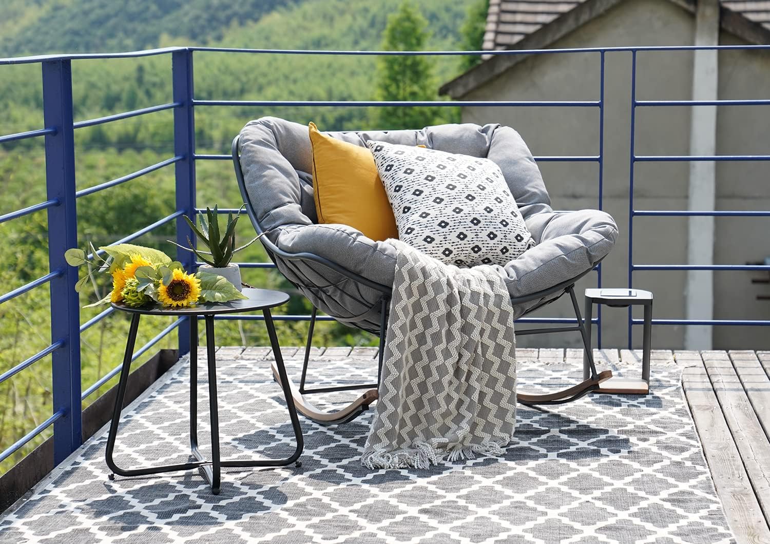 Constructed with a sturdy powder-coated steel frame, our outdoor rocking chair can support up to 330LBS. The woodgrain finish on the curved base complements your decor seamlessly.