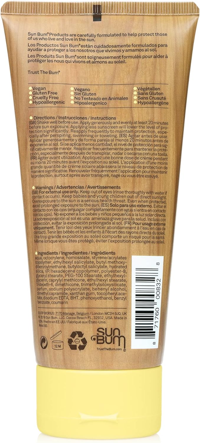 This moisturizing sunscreen formula will protect your skin from harmful UVA/UVB rays while enriching your skin with Vitamin E, an antioxidant that helps to neutralize free radicals, which are the main cause of premature skin aging. Broad Spectrum UVA / UVB Protection, Vegan, Gluten Free, Cruelty Free, Free From Oxybenzone & Octinoxate, Sun Bum Original Scent, Water Resistant (80 Minutes)