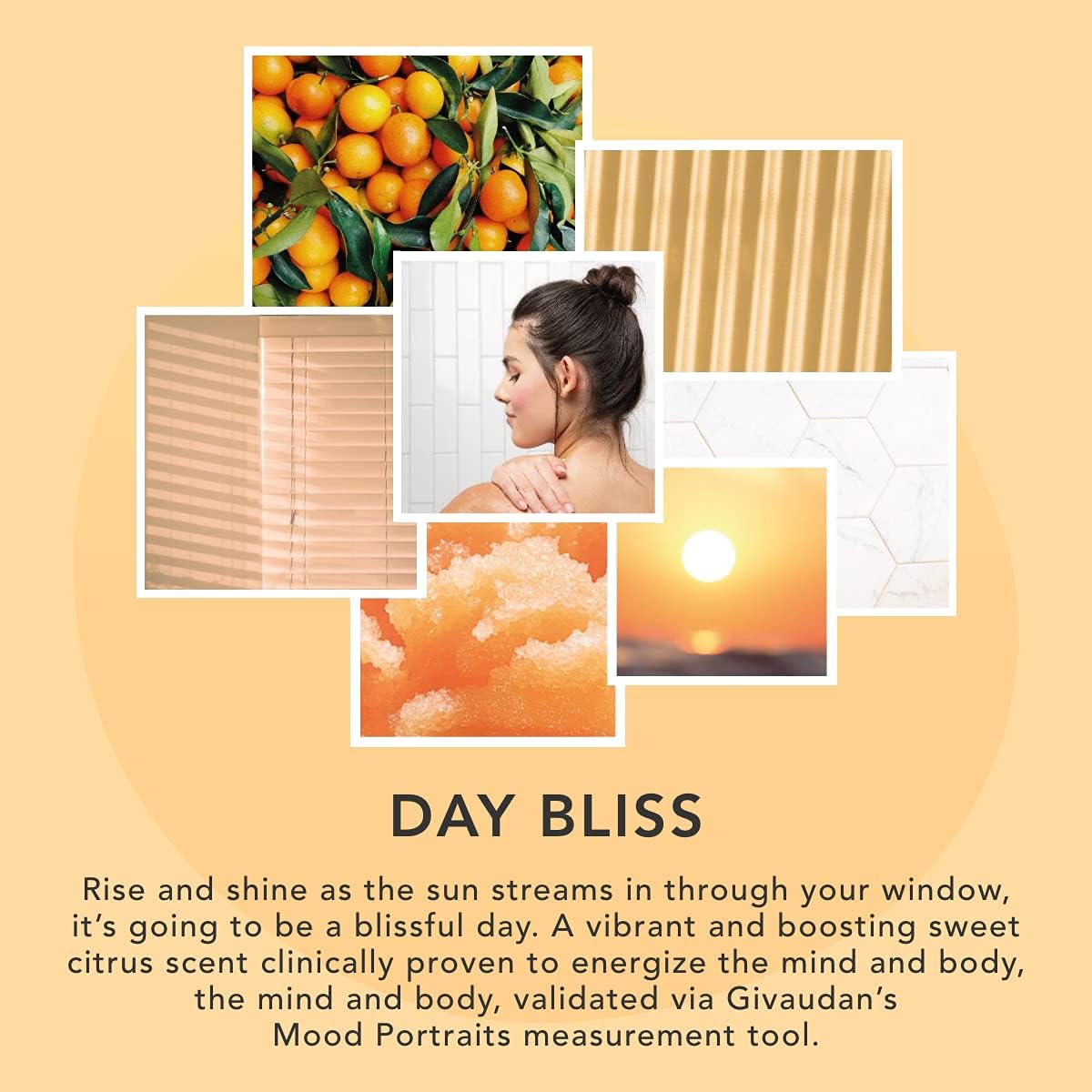 A vibrant and boosting sweet citrus scent clinically proven to energize the mind and body, validated via Givaudan’s Mood Portraits® measurement tool