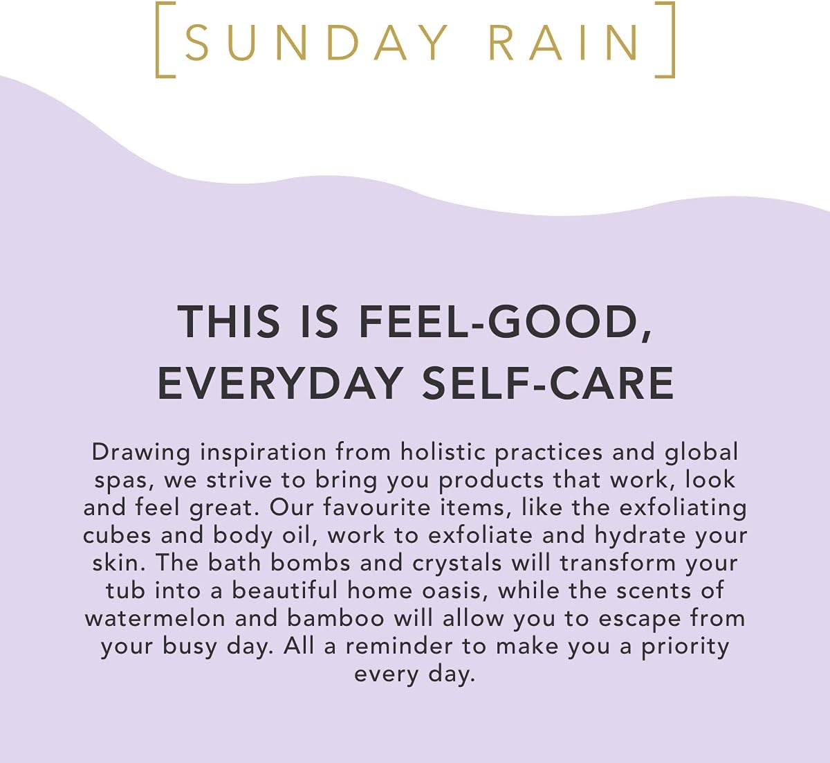 Vegan & Animal Cruelty Free: All our delightful Sunday Rain products are 100% vegan and completely cruelty-free. Our products are consciously created with you and the planet top of the mind