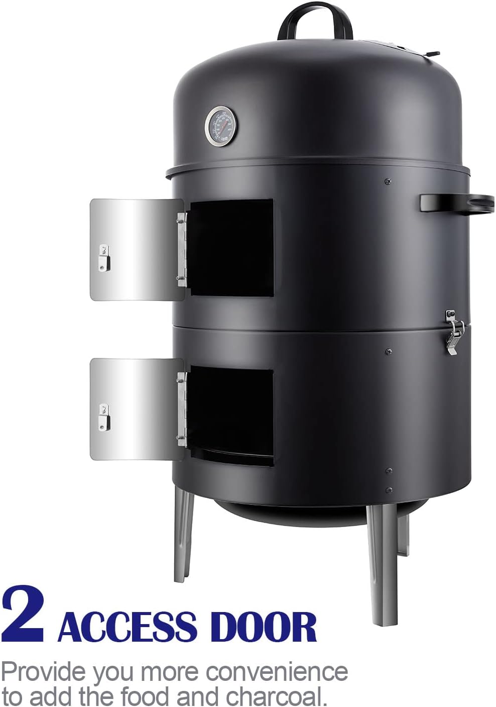 Access Doors The charcoal grill with lid has 2 access doors it is more flexible to check the food status and add charcoal wood or pellets without removing the whole layer to avoid heat. The porcelainenamelled water pan traps smokers and moisture to impart a smoky flavor to your meat.