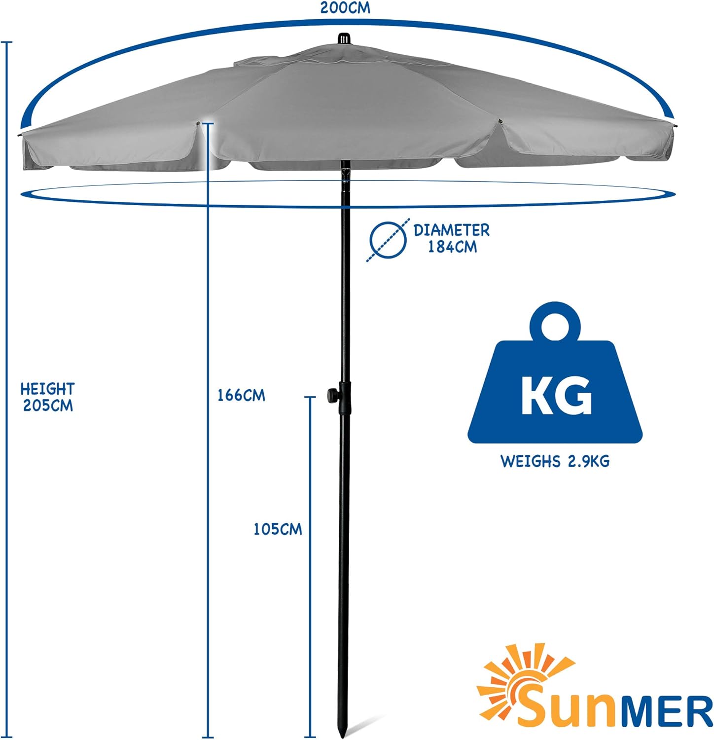 SUNMER 2M Grey Umbrella, Beach Parasol
