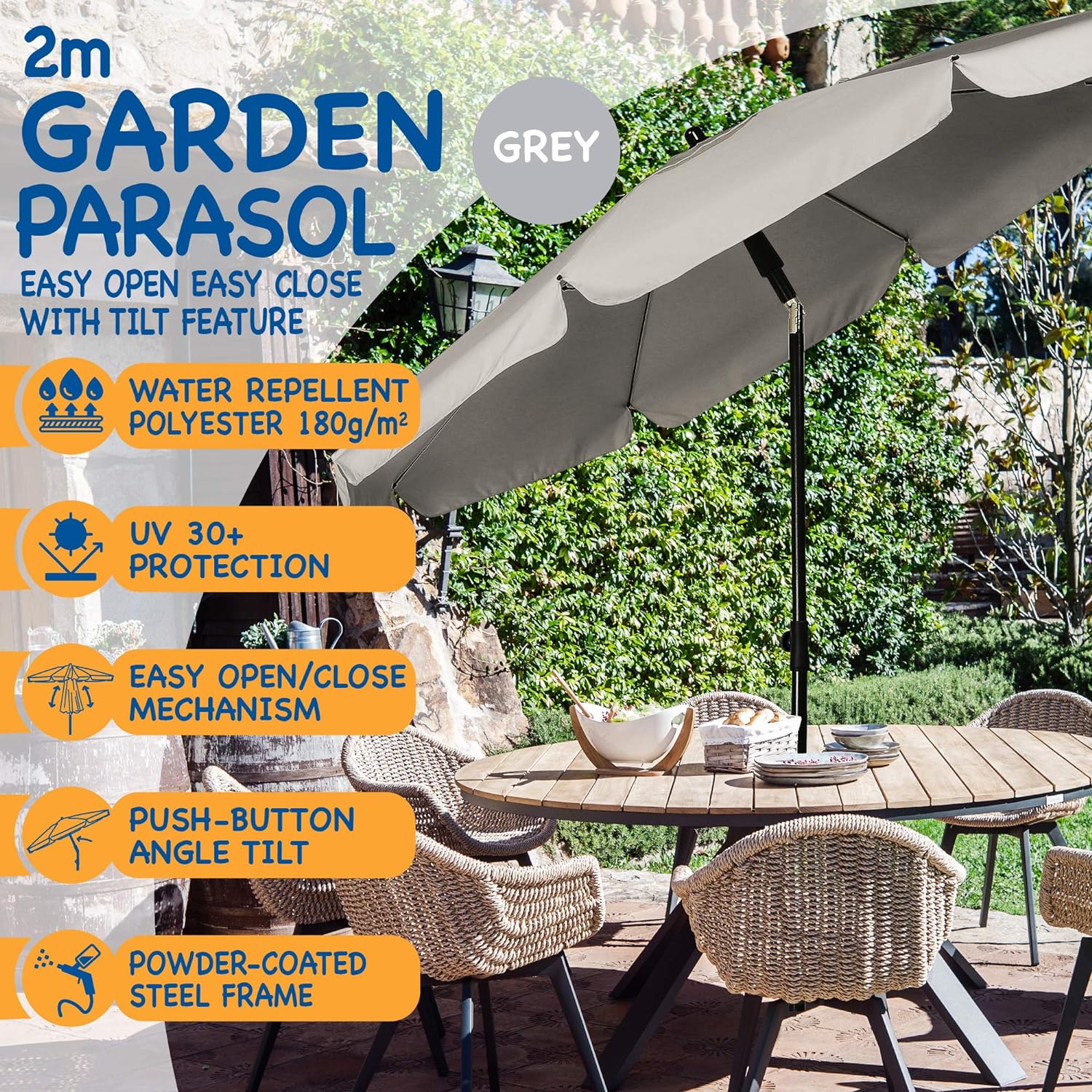 SUNMER 2M PARASOL: This SUNMER 2M Grey Parasol is the ideal solution for blocking out the summer sun. It is easy to open and close and also has a tilt mechanism that allows you to adjust the angle of the canopy. This parasol is ideal for gardens, decking, backyards, pool sides and more.