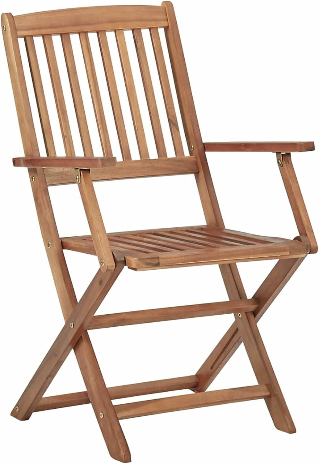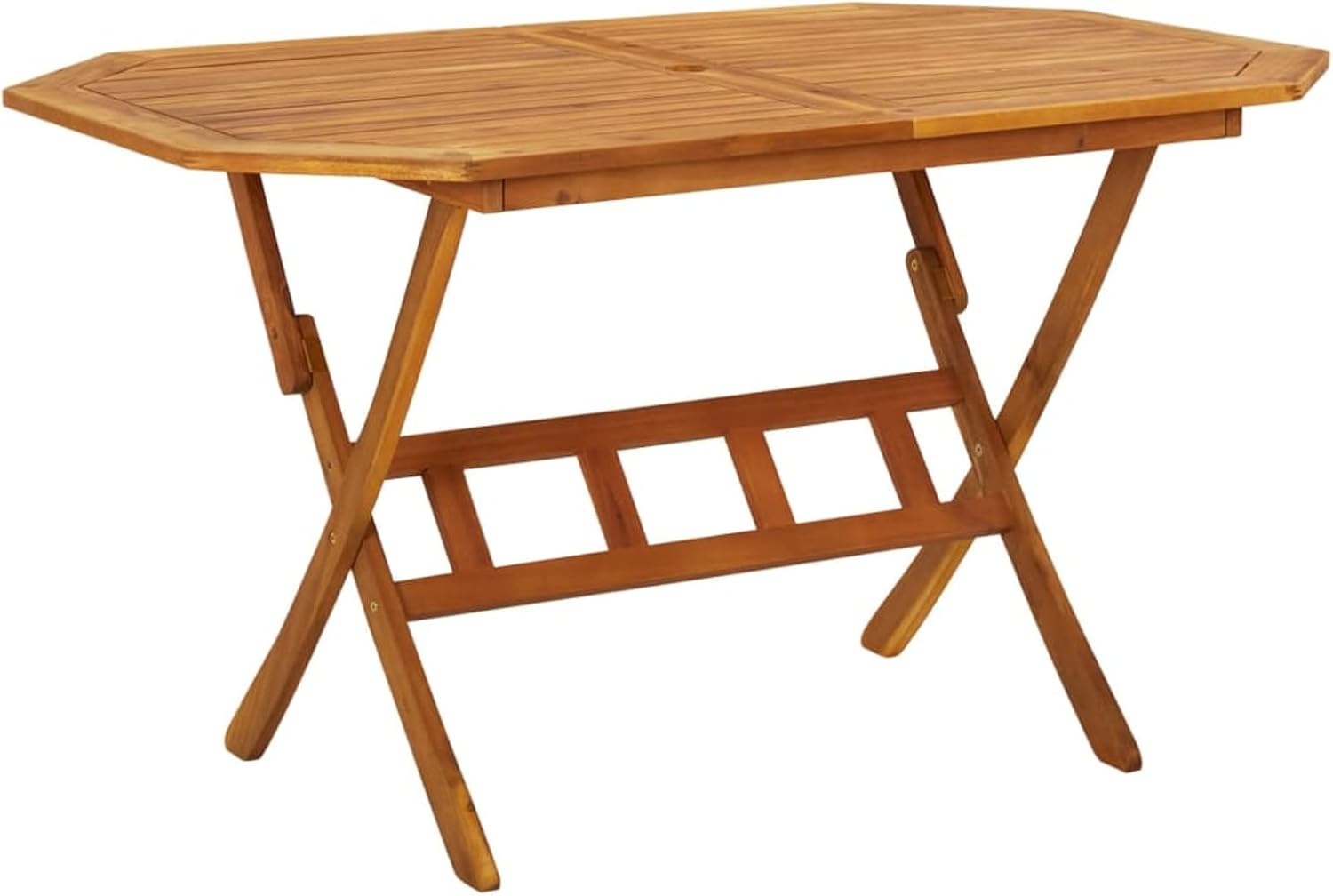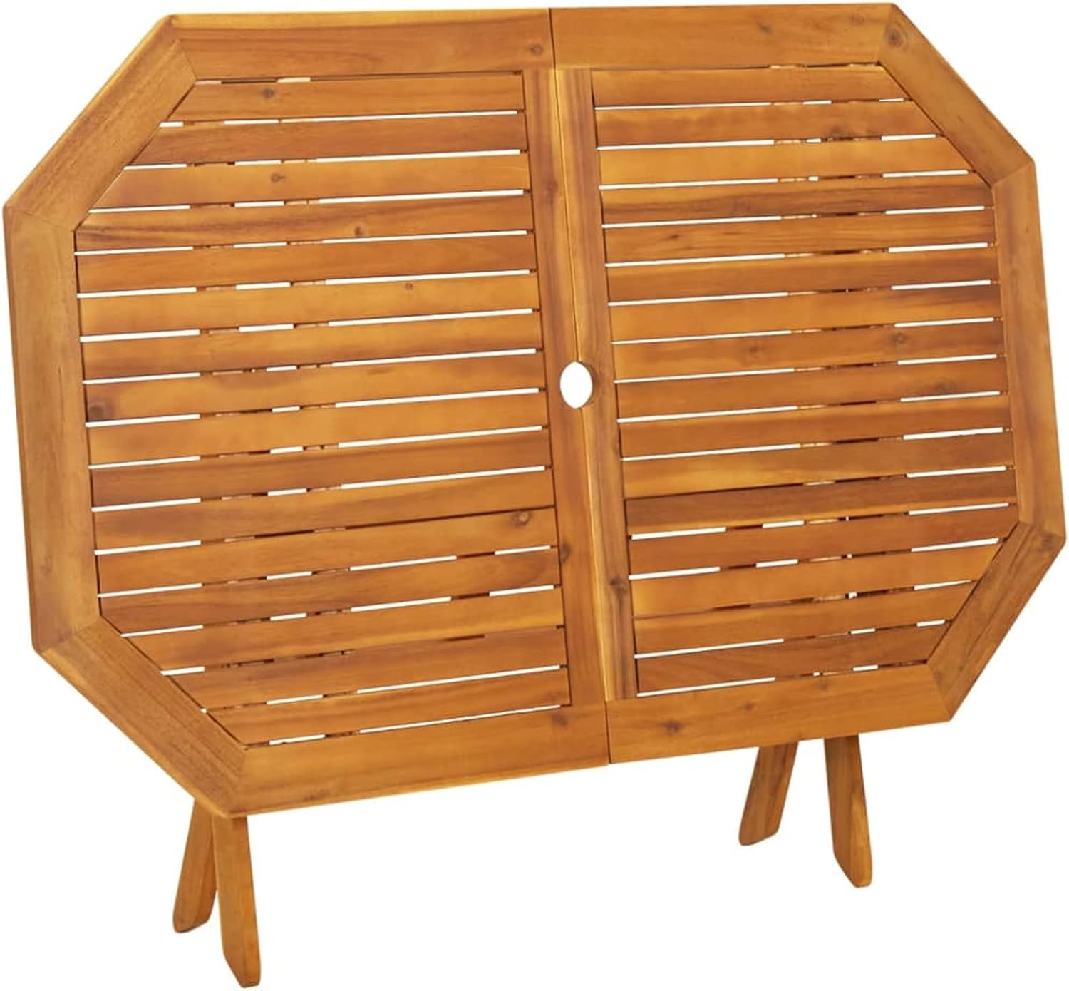 Create a compelling and cohesive aesthetic in your outdoor space with this wooden garden dining set! This outdoor dining set is made of solid acacia wood, a tropical hardwood, which is weather-resistant and durable for years of use. The oil-finished surface is easy to clean with a damp cloth. Additionally, the patio chairs and table can be folded into a compact size to save space when not in use. Note: In order to extend the life of your outdoor furniture, we recommend you to clean it regularly and do not leave it outdoors without protection unnecessarily.Clean: Use a mild soap solution.Storing: If possible, store in a cool, dry place indoors. If the product is stored outdoors, protect it with a waterproof cover. Wipe and dry the excess water or snow from flat surfaces after a rain or snow fall. Allow sufficient air circulation to avoid moisture-related damage. Table: Material: Solid acacia wood Dimensions: 135 x 85 x 75 cm (L x W x H) Hole diameter: 50 mm Foldable Chair: Material: Solid acacia wood with an oil finish Dimensions (when unfolded): 54 x 57 x 91 cm (W x D x H) Dimensions (when folded): 54 x 15 x 109 cm (L x W x H) Seat width: 44 cm Seat depth: 39 cm Seat height from the ground: 44 cm Armrest height from the ground: 64 cm Assembly required: Yes Delivery contains: 1 x Table 4 x Chair Wecannotshipto: Guernsey, Outer Hebrides, Isle of Man,Jersey,Kirkwall,Shetland islands.