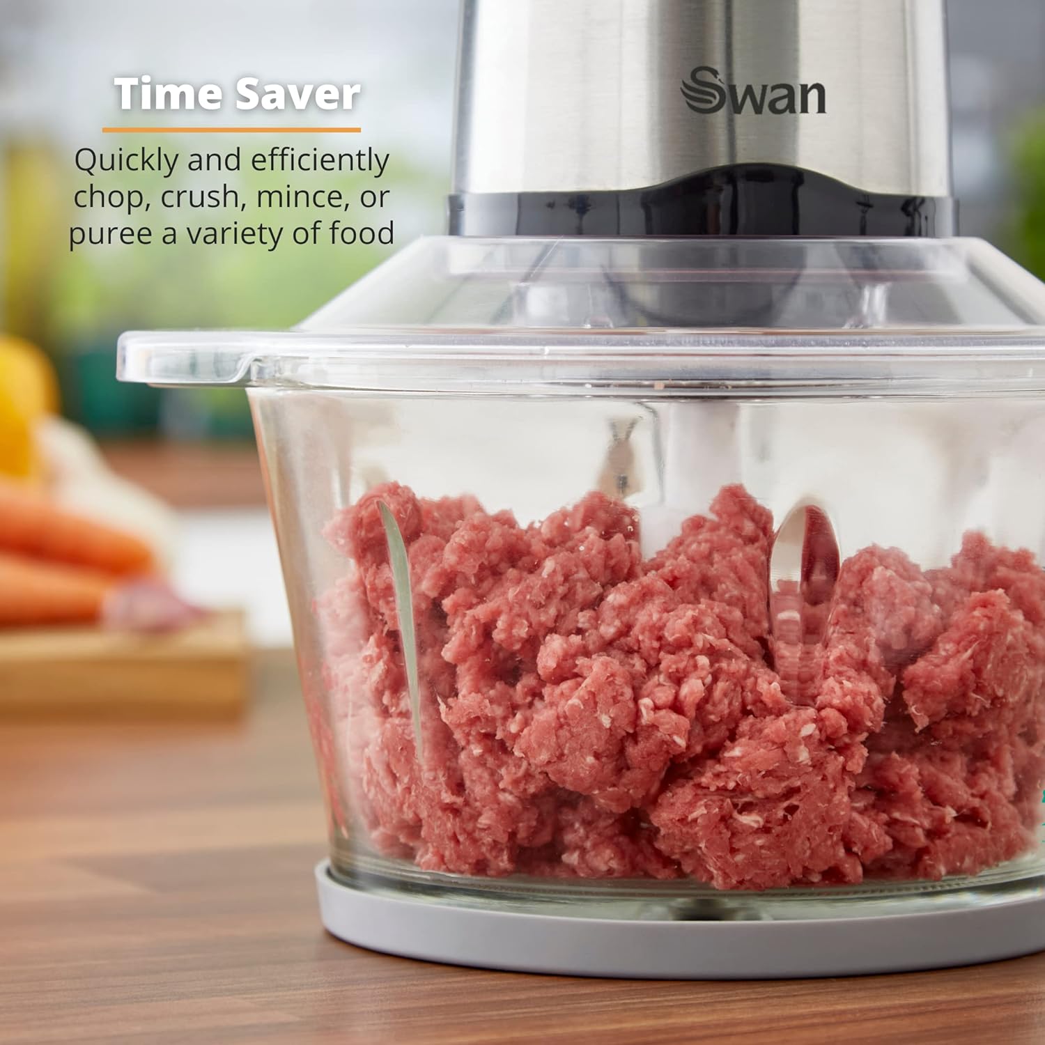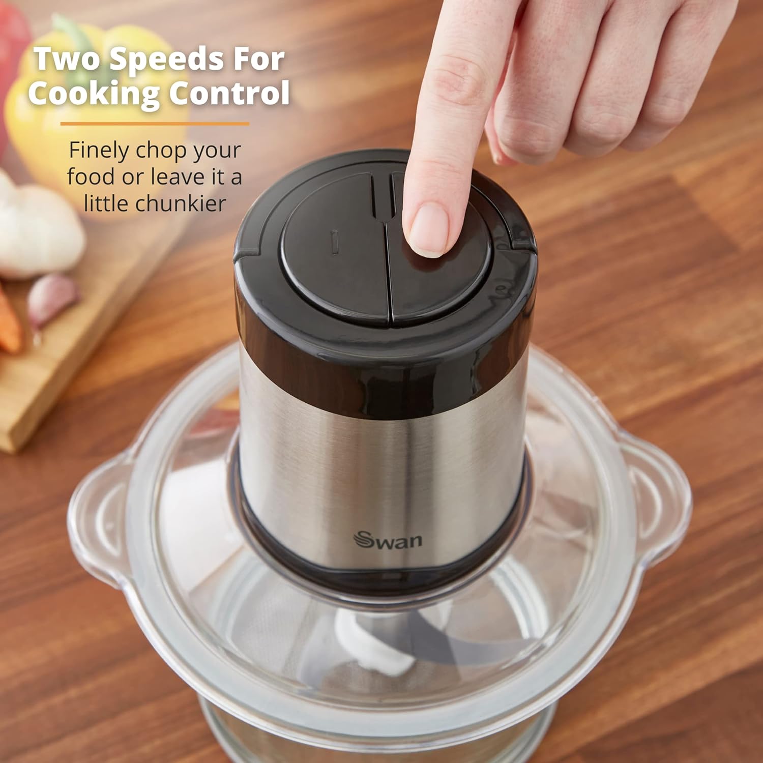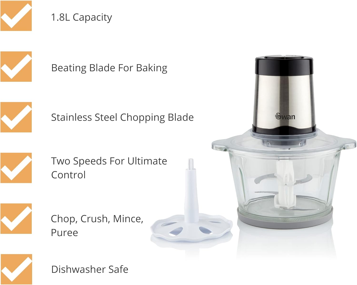 Swan Electric Food Chopper, Food Processor, 1.8L Glass Bowl, 26000 RPM Motor, Stainless Steel Blade & Beating Blade, Anti-slip Removeable Mat, 2 Speed Settings, Stainless Steel, SP42010N
