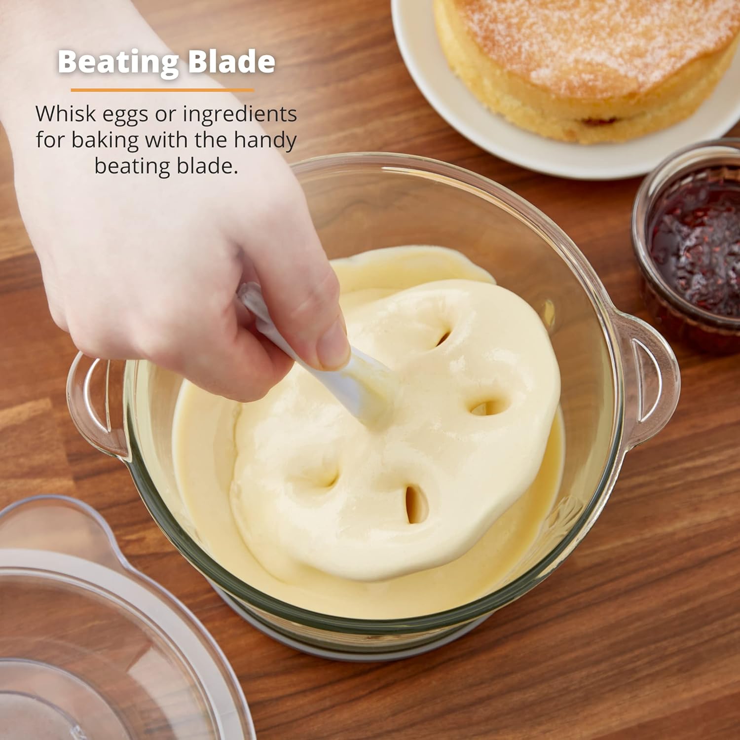 The double stainless-steel cutting blade can transform your ingredients any way you need. A handy beating blade is included too for whisking eggs.