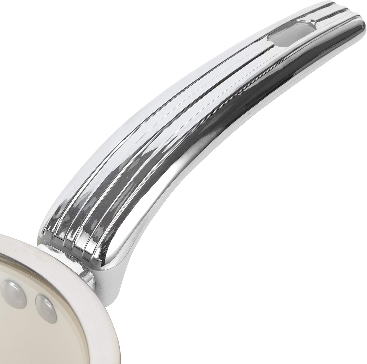 Stay-cool, soft-touch Bakelite handles with metallic accents offer safe and comfortable control over your cooking