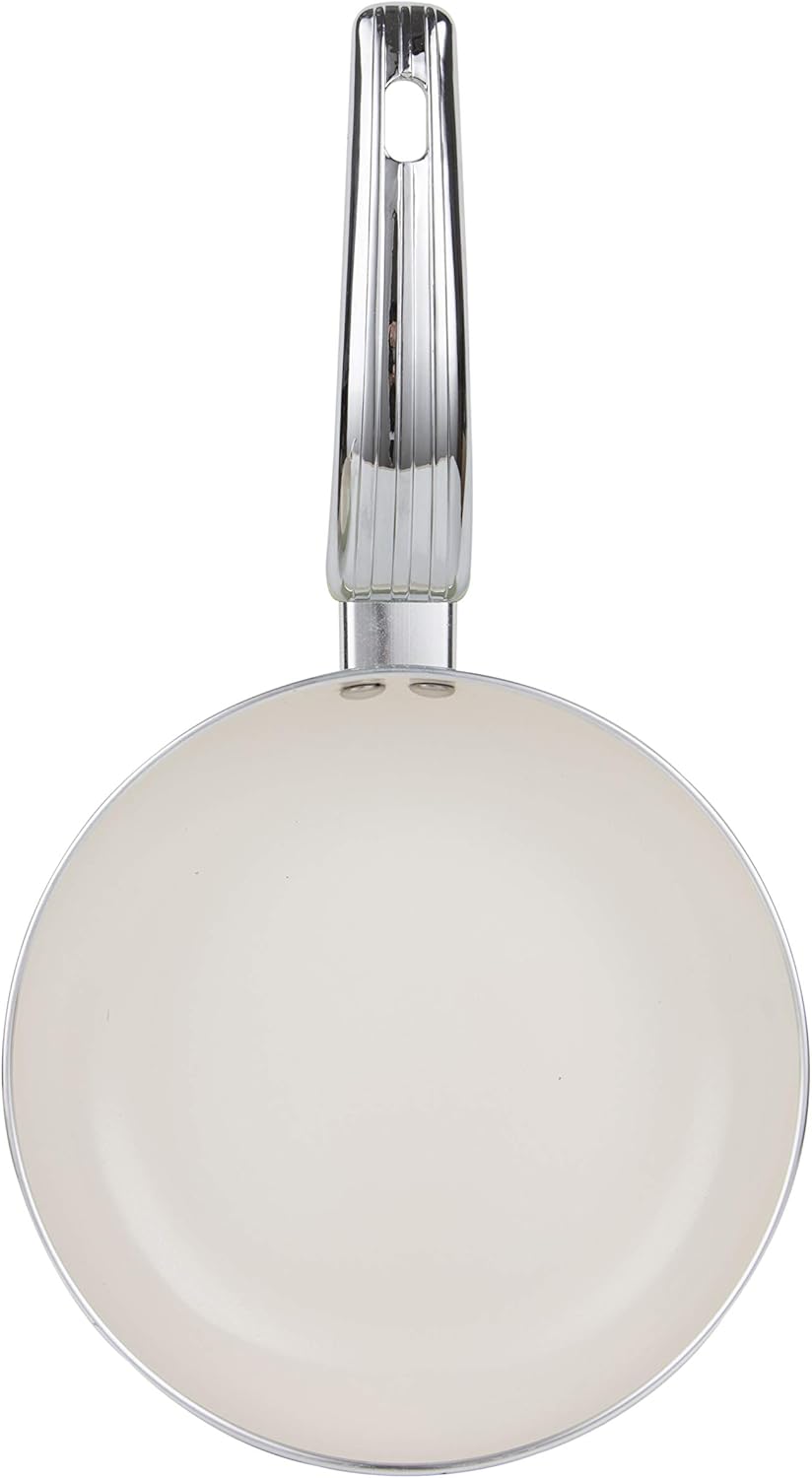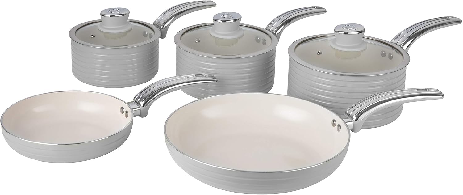 This set offers a range of saucepan sizes as well as 2 large frying pans, all coated with non-stick ceramic ivory. This allows for meals to be cooked using little to no oil, making this set ideal for creating a variety of healthy dishes for one person or the whole family.