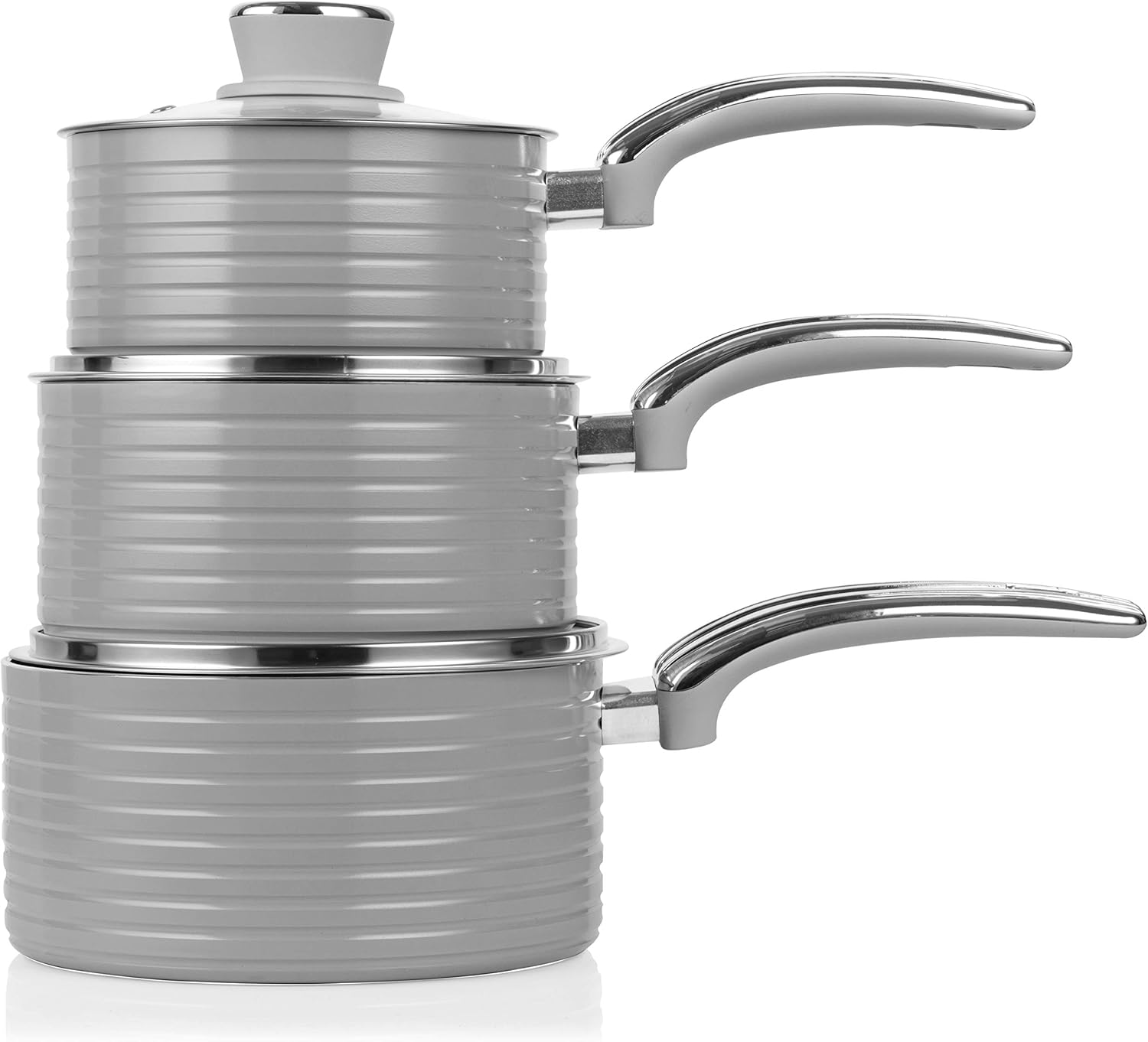 Swan SWPS5020GRN Retro 5 Piece Pan Set With Glass Lids, Non Stick Ceramic Coating, Grey