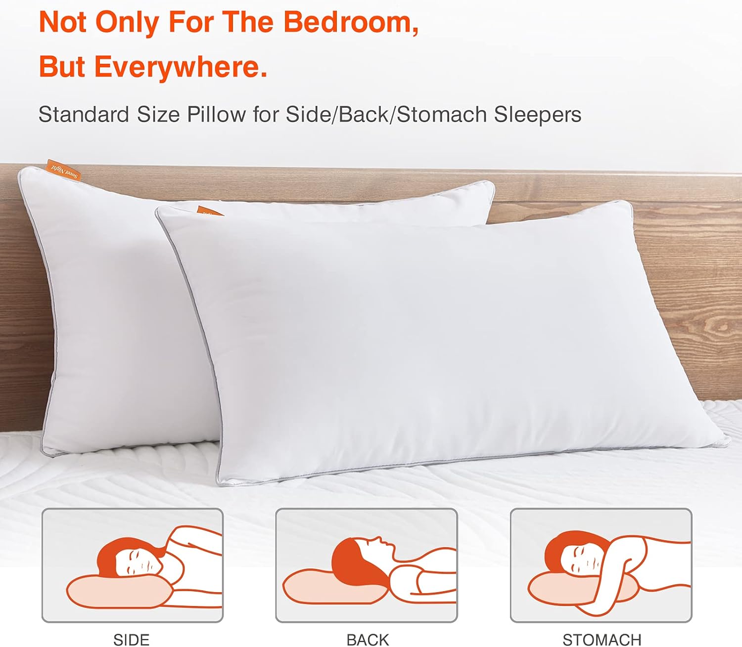 BREATHABLE & COMFORTABLE: Filled with 1200g hollow fiber results in a comfortable and soft pillow for sleeping. Smooth pure 100% cotton fabric offers an incredible feel to the skin for the pleasure of side or stomach sleeper and greater air ventilation for keeping warm. These pillows promote proper alignment allowing deeper sleep through the night and helping those tossing & turning, insomnia, migraines, lessens snoring.