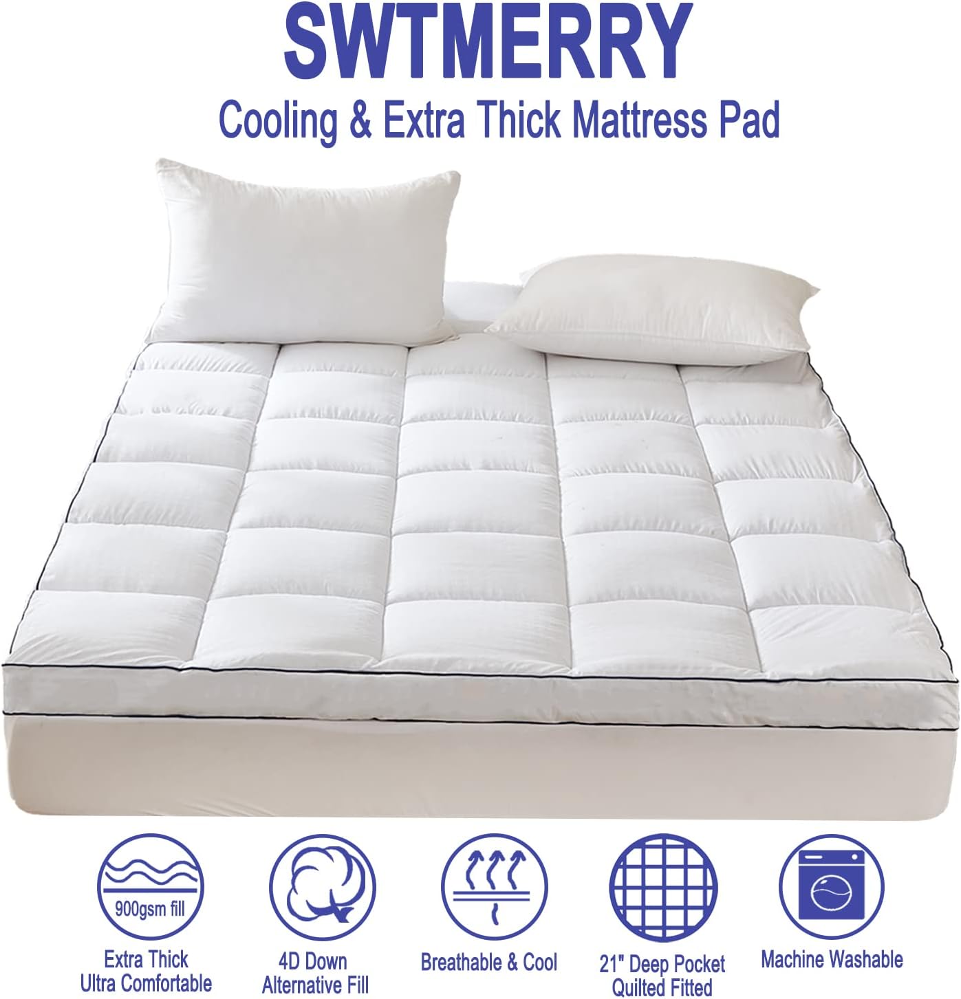 SWTMERRY Queen Size Mattress Pad Topper – Extra Thick Quilted Fitted Mattress Protector Pillow Cotton Top with 21″ Deep Pocket for 8-24 inches Mattress,Soft and Breathable Bed Topper Cover