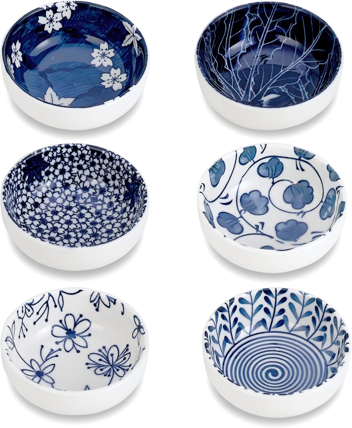 Swuut Japanese Style Ceramic Pinch Bowls,3 Inch Dipping Bowls Set Side Sauce Cups,Dishes for Sushi,Snack and Soy,BBQ,2.5 Oz Blue and White Mini Bowls for Kitchen Prep – Set of 6